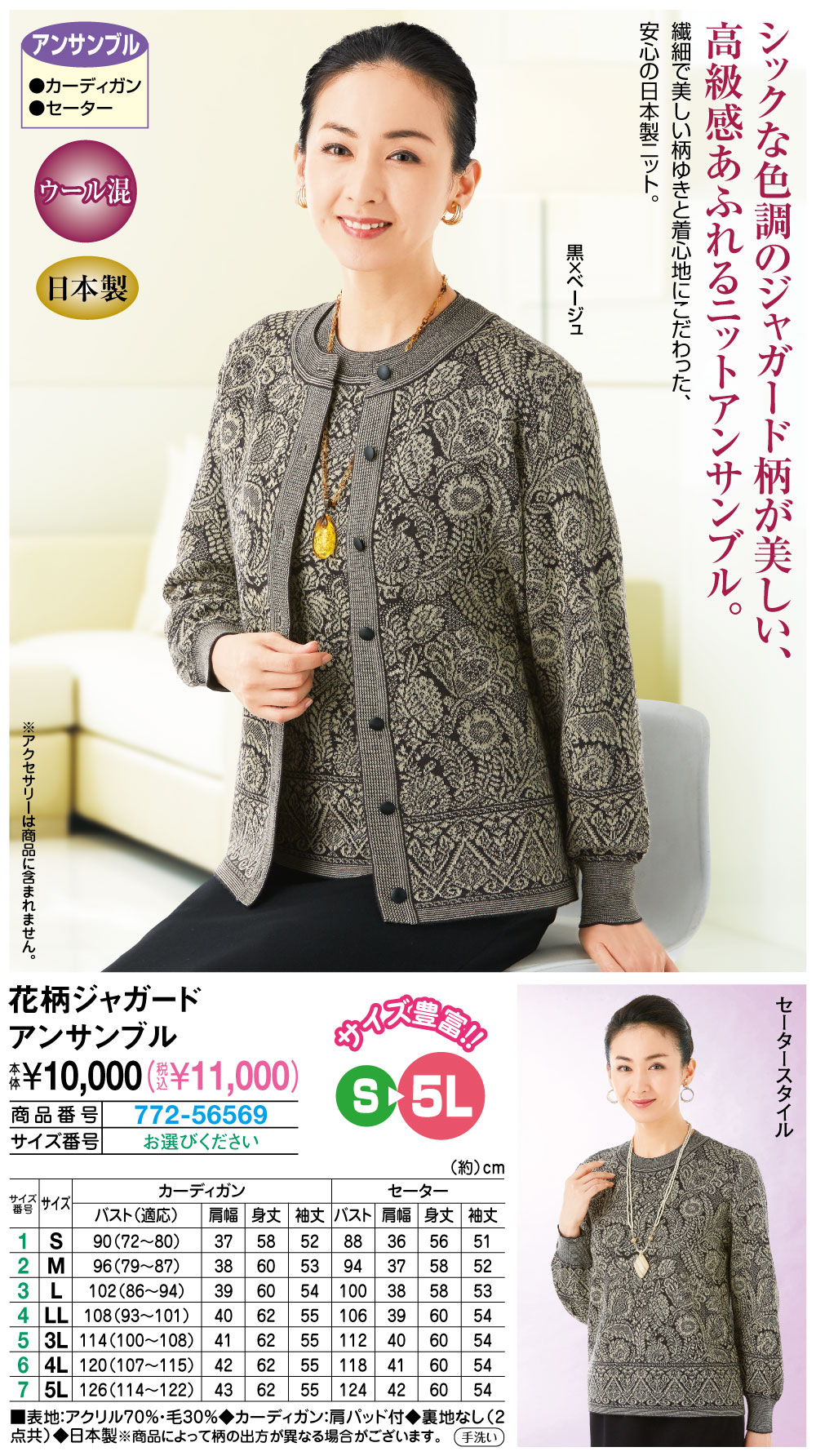 カーディガン【サイズ(約)】 バスト(適応)、肩幅、身丈、袖丈 <S>90(72~80)cm、37cm、58cm、52cm <M>96(79~87)cm、38cm、60cm、53cm <L>102(86~94)cm、39cm、60cm、54cm <LL>108(93~101)cm、40cm、62cm、55cm <3L>114(100~108)cm、41cm、62cm、55cm <4L>120(107~115)cm、42cm、62cm、55cm <5L>126(114~122)cm、43cm、62cm、55cm セーター【サイズ(約)】 バスト、肩幅、身丈、袖丈 <S>88cm、36cm、56cm、51cm <M>94cm、37cm、58cm、52cm <L>100cm、38cm、58cm、53cm <LL>106cm、39cm、60cm、54cm <3L>112cm、40cm、60cm、54cm <4L>118cm、41cm、60cm、54cm <5L>124cm、42cm、60cm、54cm ■表地:アクリル70%・毛30% ◆カーディガン:肩パッド付 ◆裏地なし(2点共) ◆日本製