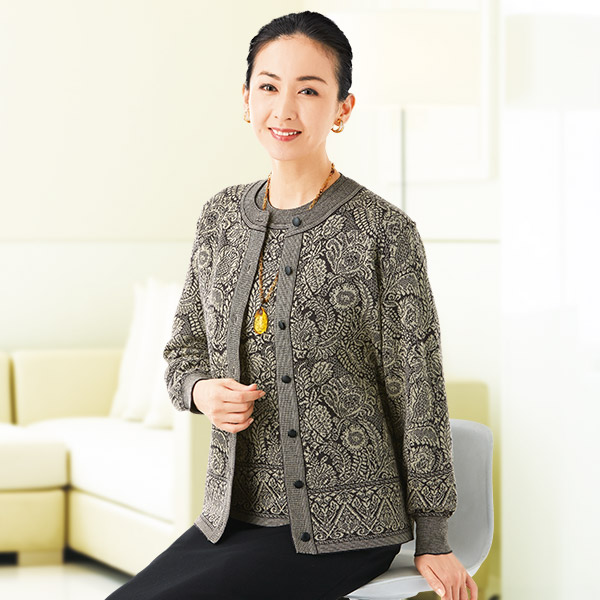 シックな色調のジャガード柄が美しい、高級感あふれるニットアンサンブル! 繊細で美しい柄ゆきと着心地にこだわった、安心の日本製ニット。 【アンサンブル】 ・カーディガン ・セーター ●ウール混 ●サイズ豊富!!S~5L