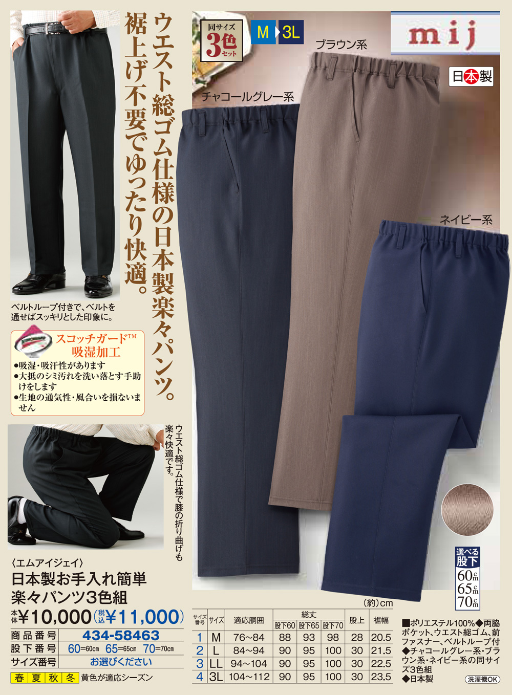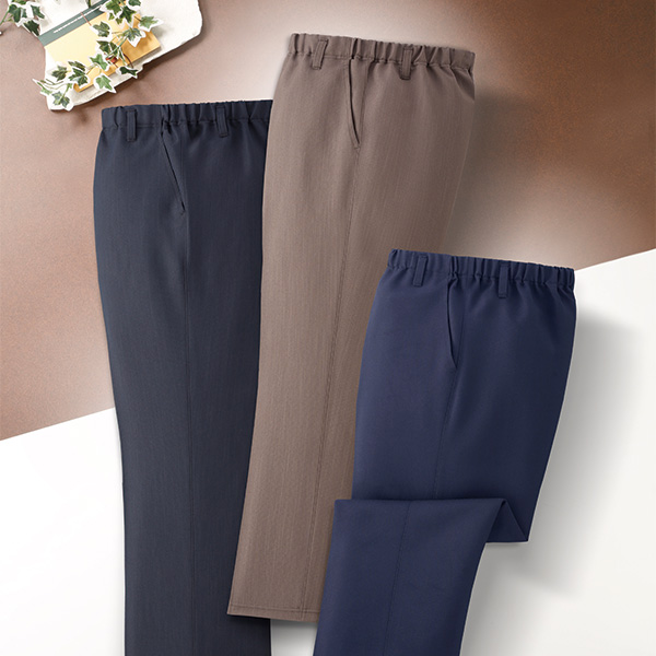■ポリエステル100% ◆両脇ポケット、ウエスト総ゴム、前ファスナー、ベルトループ付 ◆チャコールグレー系・ブラウン系・ネイビー系の同サイズ3色組 ◆日本製