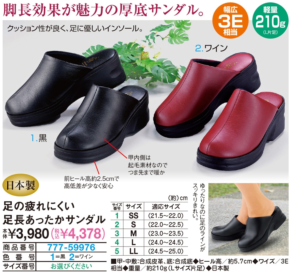 【サイズ(約)】 適応サイズ <SS>(21.5~22.0)cm <S>(22.0~22.5)cm <M>(23.0~23.5)cm <L>(24.0~24.5)cm <LL>(24.5~25.0)cm ■甲・中敷:合成皮革、底:合成底 ◆ヒール高/約5.7cm ◆ワイズ/3E相当 ◆重量/約210g(Lサイズ片足) ◆日本製