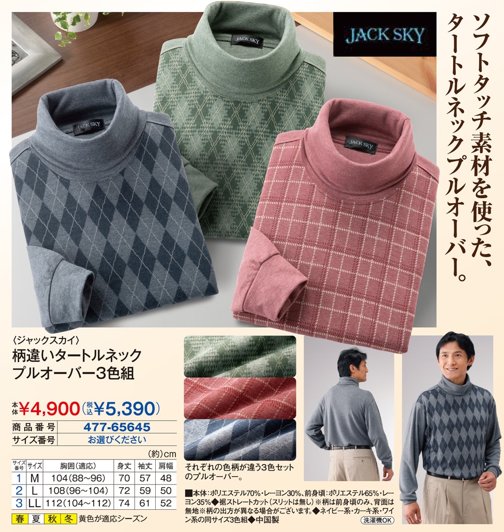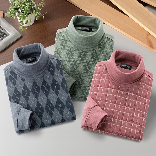 ソフトタッチ素材を使った、タートルネックプルオーバー それぞれの色柄が違う3色セットのプルオーバー。