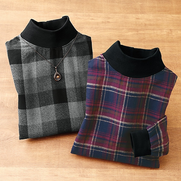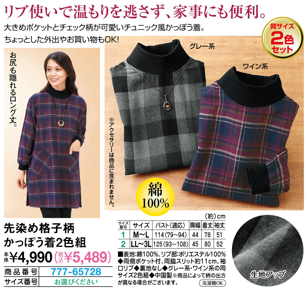 リブ使いで温もりを逃さず、家事にも便利! 大きめポケットとチェック柄が可愛いチュニック風かっぽう着。 ちょっとした外出やお買い物もOK! お尻も隠れるロング丈。 ●同サイズ2色セット