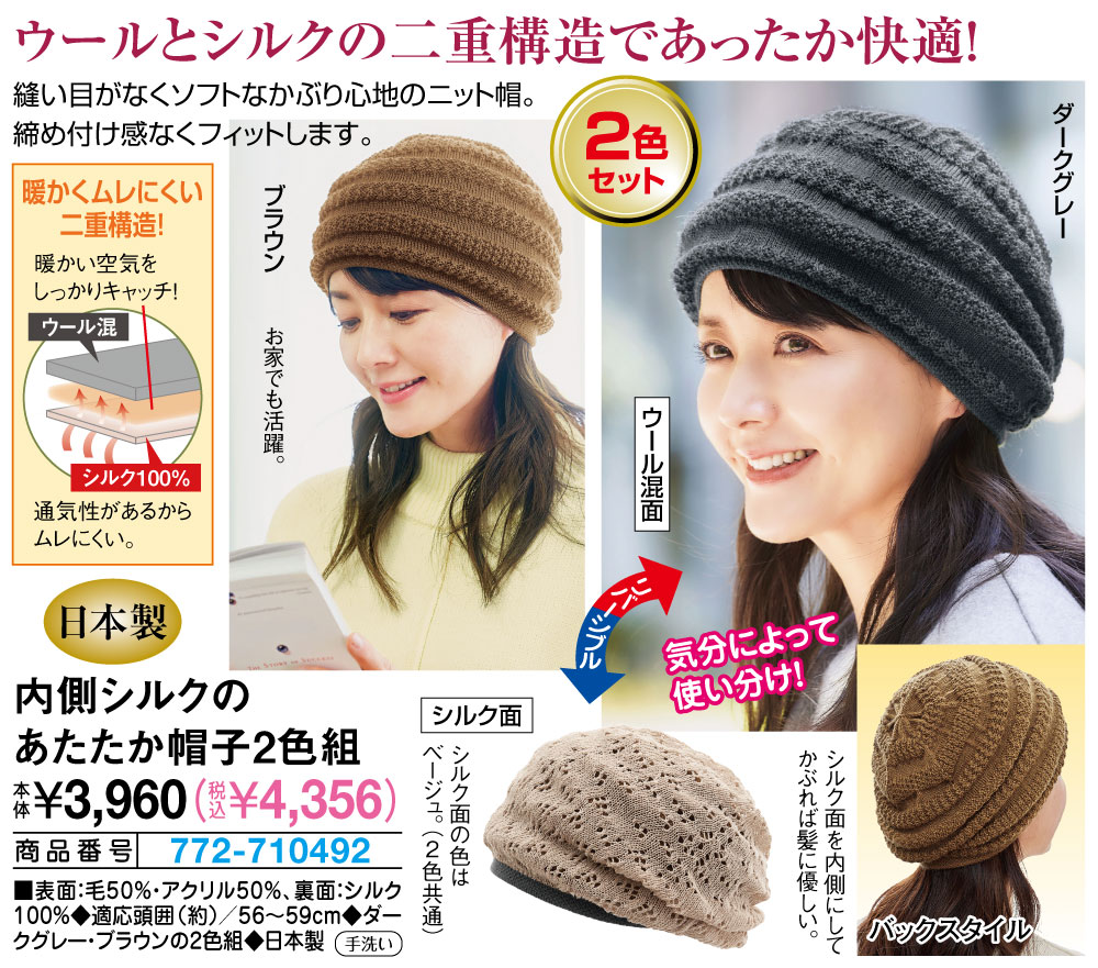 ウールとシルクの二重構造であったか快適! 縫い目がなくソフトなかぶり心地のニット帽。 締め付け感なくフィットします。 おうち時間でも活躍。 【暖かくムレにくい二重構造!】 ・ウール混 暖かい空気をしっかりキャッチ! ・シルク100% 通気性があるからムレにくい。 【リバーシブル】 気分によって使い分け! ・ウール混面 ・シルク面/シルク面の色はベージュ。(2色共通) シルク面を内側にしてかぶれば髪に優しい。 ●2色セット
