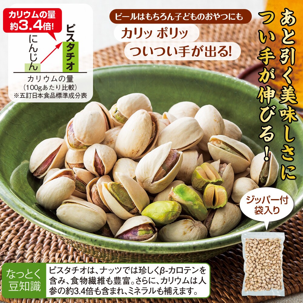 「ナッツの女王」とも呼ばれるピスタチオをたっぷりお届け。 独特の風味や味を変化させにくい殻付きで、ビールのお供にもぴったりです。 ビールはもちろん子どものおやつにも カリッ ポリッついつい手が出る! ピスタチオは、ナッツでは珍しくβ-カロテンを含み、食物繊維も豊富。 さらに、カリウムは人参の約3.4倍も含まれ、ミネラルも補えます。