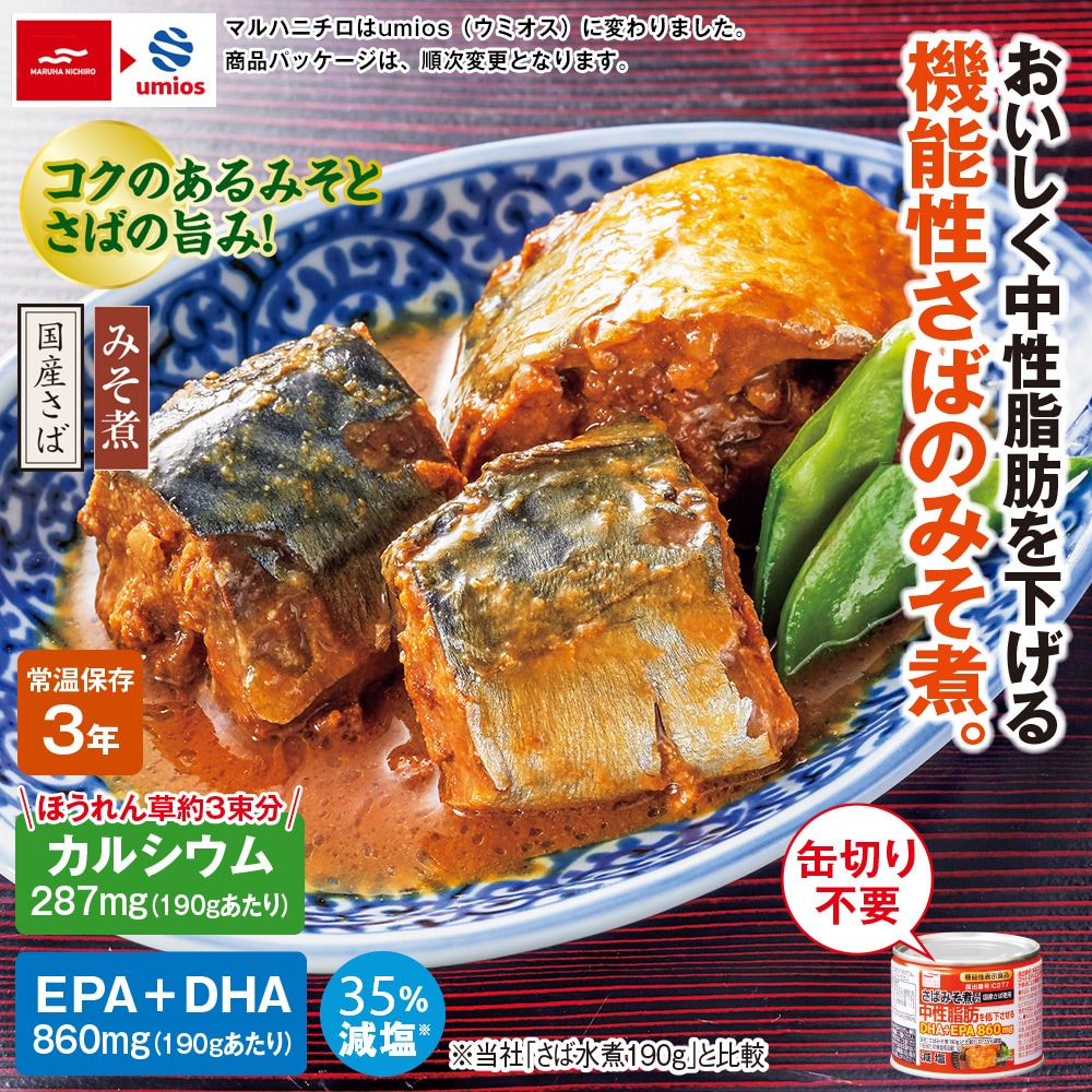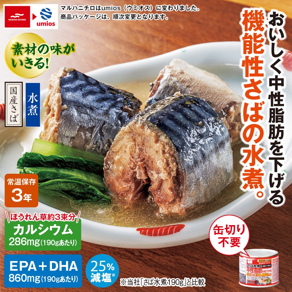 国産さば使用 <水煮> 中性脂肪を低下させるDHAとEPAを含有。 素材の味を活かしたおいしさです。 ほうれん草約3束分 カルシウム286mg(190gあたり) EPA+ DHA860mg(190gあたり) 25%減塩※ ※当社「さば水煮190g」と比較 常温保存3年 缶切り不要 <みそ煮> 中性脂肪を低下させるDHAとEPAを含有。 コクと旨みのある、みその味わいが食欲をそそります。 ほうれん草約3束分 カルシウム287mg(190gあたり) EPA+ DHA860mg(190gあたり) 35%減塩※ ※当社「さばみそ煮190g」と比較 常温保存3年 缶切り不要
