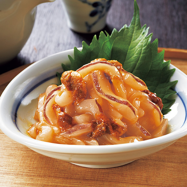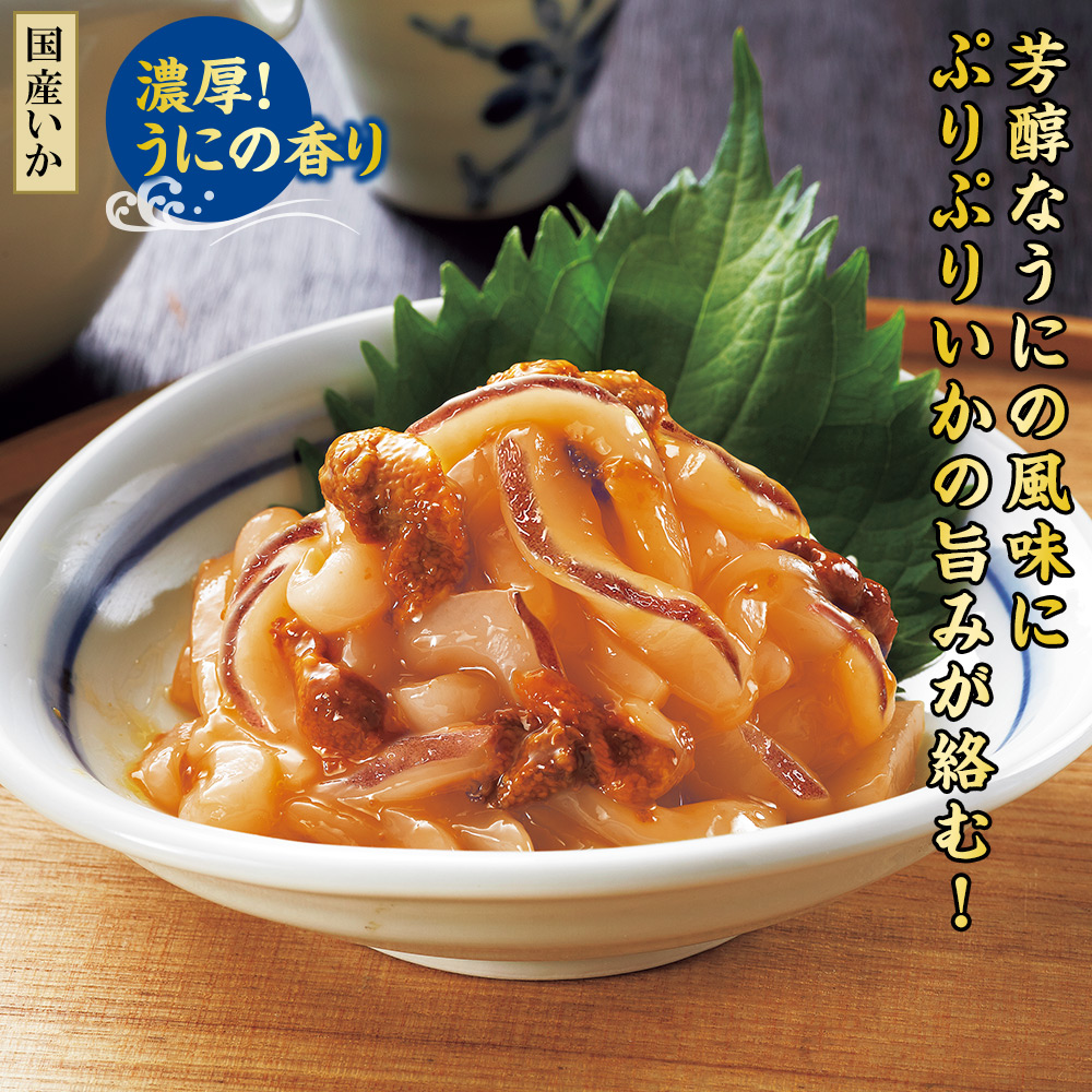 【国産いか】 濃厚!うにの香り。 刺身用のいかを濃厚な味わいのうにと合わせました。 2つの旨みといかの歯ごたえが混ざり合う、お酒のつまみにぴったりの逸品。