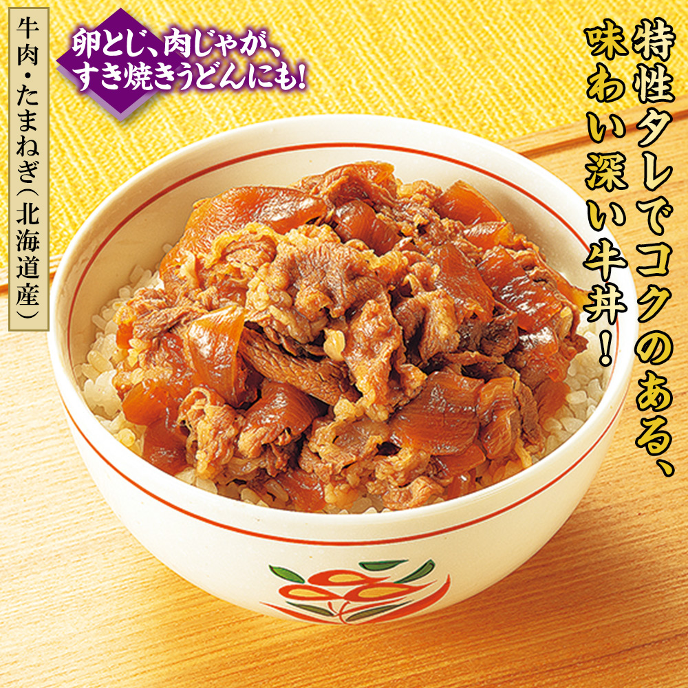 【牛肉・たまねぎ(北海道産)】 卵とじ、肉じゃが、すき焼きうどんにも! 牛すじスープを使用したコクと甘みのある特製ダレを使用。 脂のしつこさがなく、肉の旨みを味わえる牛丼です。