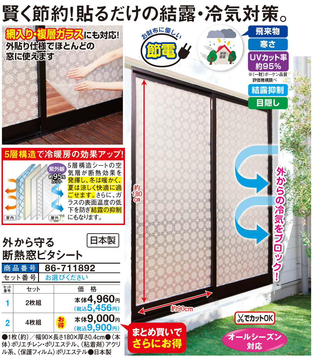 賢く節約!貼るだけの結露・冷気対策! 網入り・複層ガラスにも対応!外貼り仕様でほとんどの窓に使えます。 外からの冷気をブロック! 【5層構造で冷暖房の効果アップ!】 5層構造シートの空気層が断熱効果を発揮し、冬は暖かく、夏は涼しく快適に過ごせます。さらに、ガラスの表面温度の低下を防ぎ結露の抑制にもなります。 ●お財布に優しい節電 ●飛来物 ●寒さ ●UVカット率約95% ※(一財)ボーケン品質評価機構調べ ●結露抑制 ●目隠し ●ハサミでカットOK ●オールシーズン対応