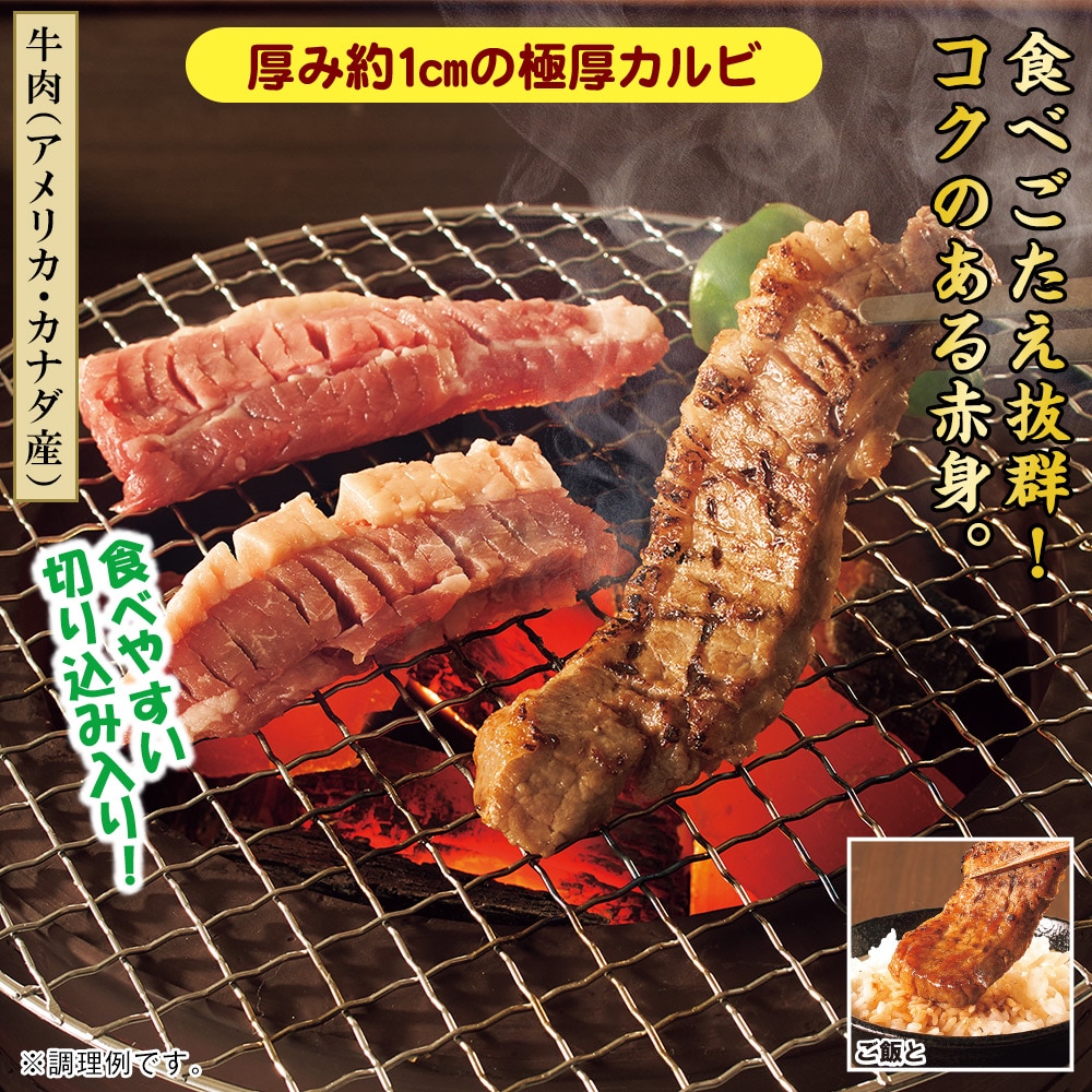 【牛肉(アメリカ・カナダ産)】 厚み約1cmの極厚カルビ。 熟練の職人の手切りで、余分な脂身やスジをカット。 厚切りだからこその旨み、肉汁を楽しめます。 食べやすい切り込み入り! ご飯と!