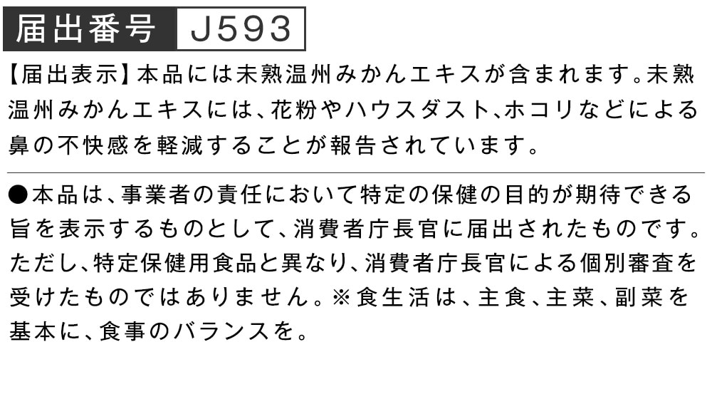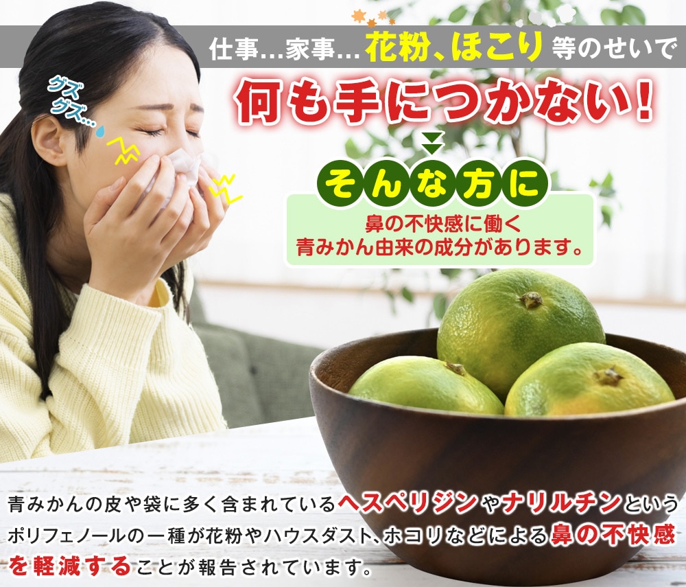 1年のうちポリフェノール量の多い時期を狙って収穫した青みかんを使用しています。 青みかんはそのままでは苦いので、国産ゆず果汁をブレンドし甘酸っぱく仕上げました。ホットでもアイスでも美味しくお召し上がり頂けます。 手軽に続けやすい個袋で使い切りタイプです。 ●未熟温州みかんエキスの働き:鼻の不快感を軽減(花粉やハウスダスト、ホコリなどによる鼻の不快感の軽減) 1日1袋、水やお湯に溶かして飲む。静岡県産の青みかんを使った、すっきり美味しいドリンク。消費者庁へ届出済の機能性表示食品です。 ●届出表示 本品には未熟温州みかんエキスが含まれます。未熟温州みかんエキスには、花粉やハウスダスト、ホコリなどによる鼻の不快感を軽減することが報告されています。 ●届出番号:J593 ●本品は、事業者の責任において特定の保健の目的が期待できる旨を表示するものとして、消費者庁長官に届出されたものです。ただし、特定保健用食品と異なり、消費者庁長官による個別審査を受けたものではありません。 ●食生活は、主食、主菜、副菜を基本に、食事のバランスを。