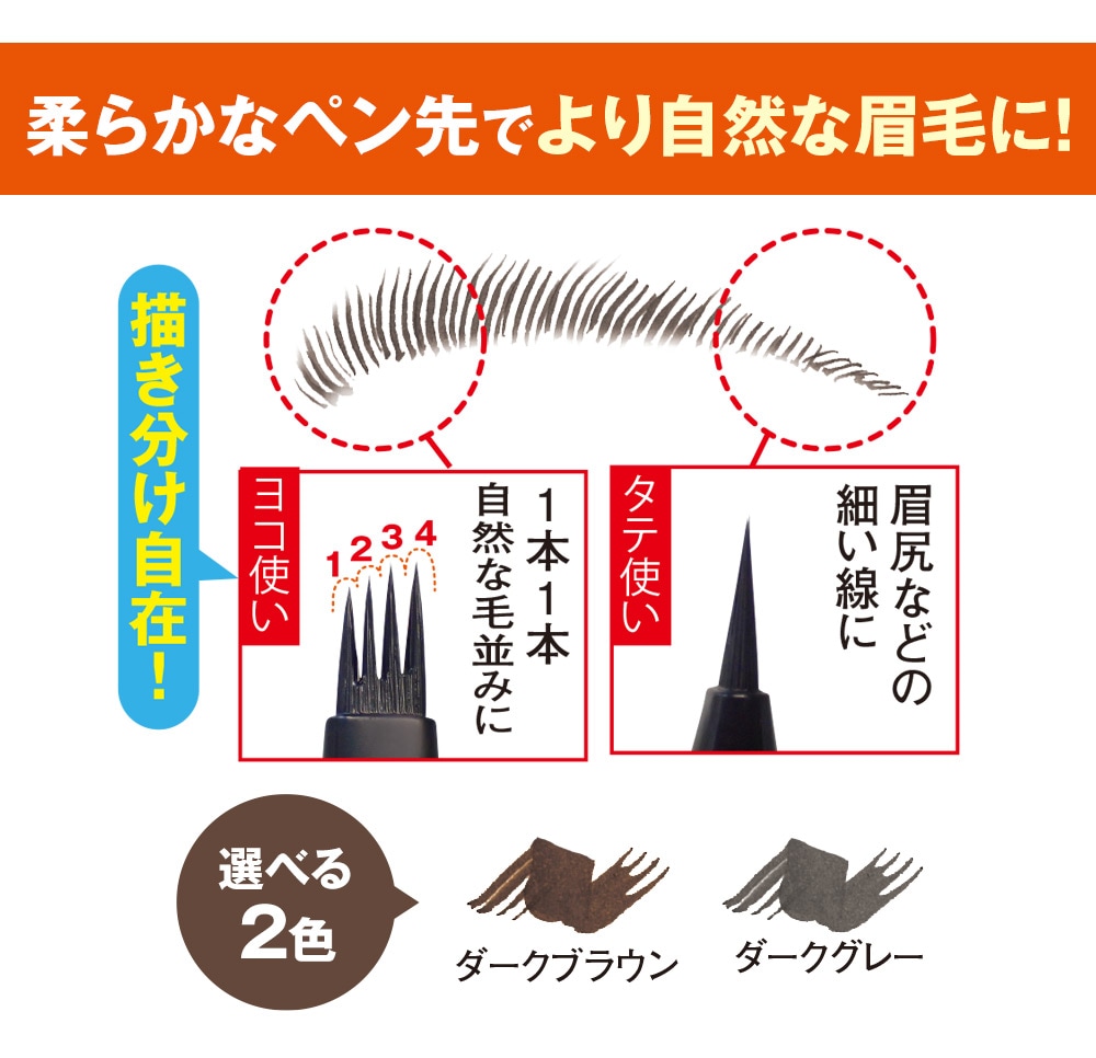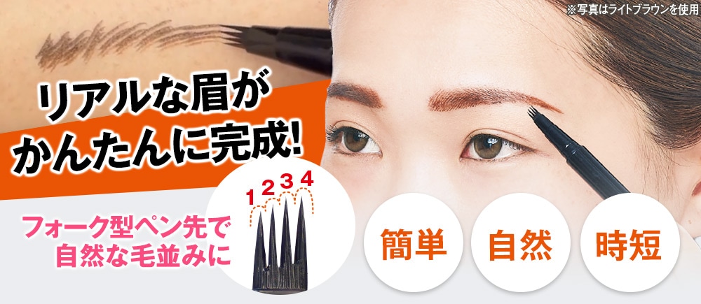 リアルな眉毛が素早く簡単に! ペン先が4つに分かれたフォーク型のリキッドアイブロウ。 まるで眉毛を1本ずつ丁寧に描き足したような自然な仕上がり! 柔らかなペン先でより自然な眉毛に!描き分け自在! ●男性にもおすすめ! ●汗や水に強い