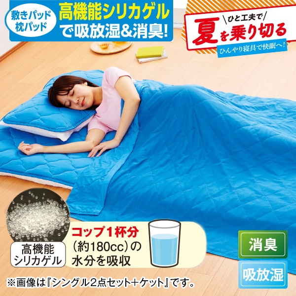 お得な冷感ケットのセットで上も下もひんやり。 <接触冷感素材> Q-MAX値0.5以上の強冷感! 高機能シリカゲルで吸放湿&消臭!(※敷パッドと枕パッド) 【セット内容】 <シングル2点セット> 敷きパッド(シングル)×1枚+枕パッド×1枚 <セミダブル2点セット> 敷きパッド(セミダブル)×1枚+枕パッド×1枚 <ダブル3点セット> 敷きパッド(ダブル)×1枚+枕パッド×2枚 <シングル2点セット+ケット> 敷きパッド(シングル)×1枚+枕パッド×1枚+ケット(シングル)×1枚 <セミダブル2点セット+ケット> 敷きパッド(セミダブル)×1枚+枕パッド×1枚+ケット(シングル)×1枚 <ダブル3点セット+ケット> 敷きパッド(ダブル)×1枚+枕パッド×2枚+ケット(シングル)×1枚