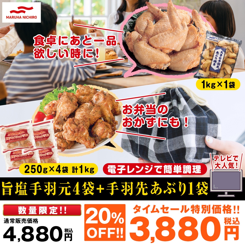 <旨塩チキンスティック 手羽元> 塩麹、黒コショウで味付した手羽元ハーフを香ばしく焼き上げました。 1本食べるとクセになる旨塩味に仕上げています。 塩麹のチカラで冷めても柔らかいです。 太い骨に近い手羽元は旨味を感じやすく、肉のボリューム感もあり満足感の高い商品です。 <大きな手羽先炙り焼き> 大きな手羽先のみを厳選し、日本人好みの醤油・砂糖で味付した手羽先の炙り焼きです。 ホットオーブンでじっくり焼き上げ、ジューシーに仕上げました。 手羽先に切れ込みを入れているので、中までしっかり味付されており、お肉が骨から取れやすく食べやすいです!
