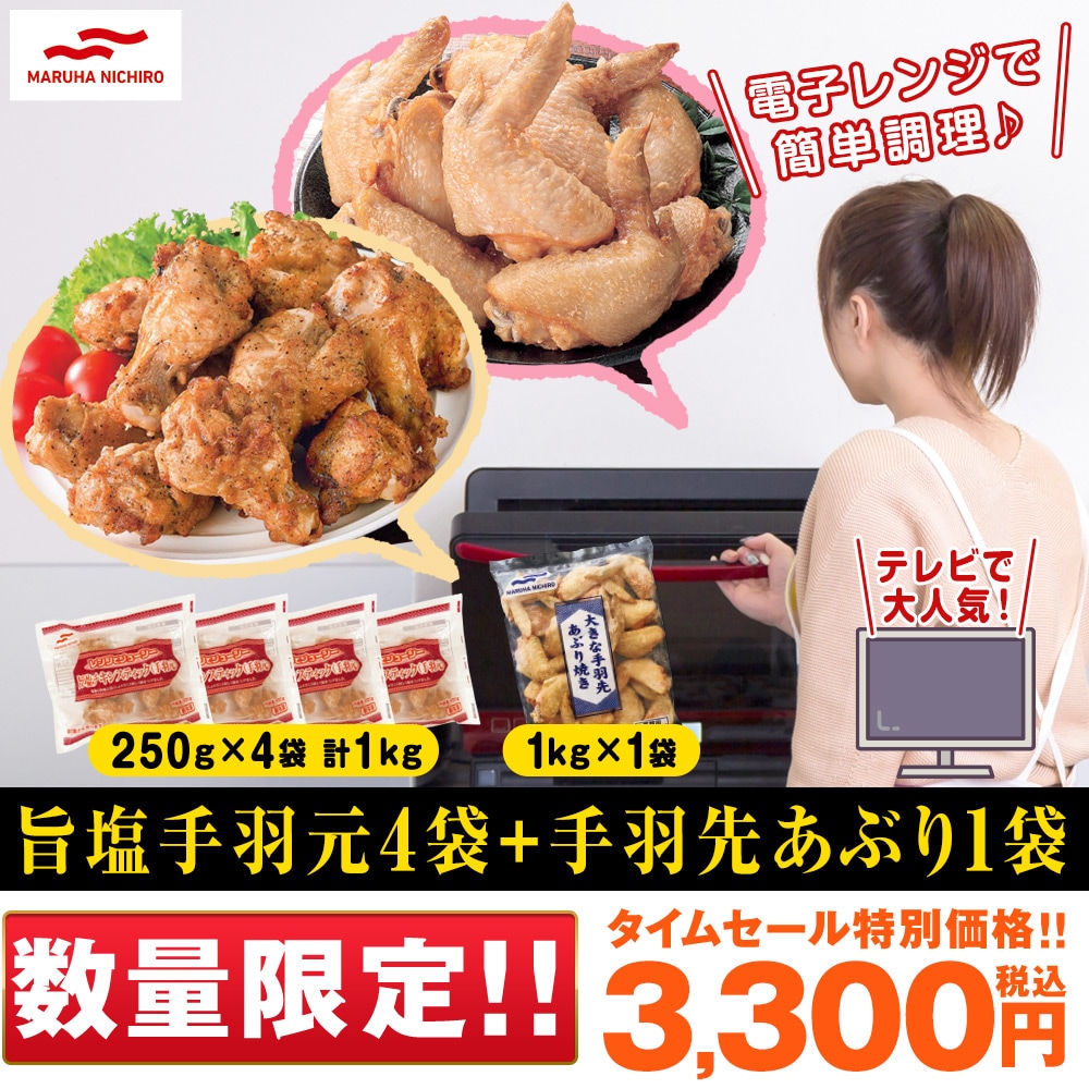 ●セット内容/<旨塩チキンスティック 手羽元>250g(約5~8本)×4袋<大きな手羽先炙り焼き>1kg(約20本)×1袋 ●賞味期限/製造日から冷凍6ヶ月 ●加工地/タイ ●原材料/<旨塩チキンスティック 手羽元>鶏手羽元(タイ産)、しょうゆ、でん粉、塩こうじ、砂糖、食塩、こしょう、衣(でん粉)、揚げ油(大豆油)/加工でん粉、ポリリン酸Na、調味料(アミノ酸)、カラメル色素<大きな手羽先炙り焼き>鶏手羽先(タイ産)、でん粉、食塩、砂糖、小麦粉、しょうゆ、卵白粉、チキンエキスパウダー、にんにく粉末、こしょう/調味料(アミノ酸等)、ポリリン酸Na、甘味料(キシロース)、着色料(パプリカ粉末) ●特定原材料等/<旨塩チキンスティック 手羽元>小麦・大豆・鶏肉<大きな手羽先炙り焼き>小麦・卵・大豆・鶏肉