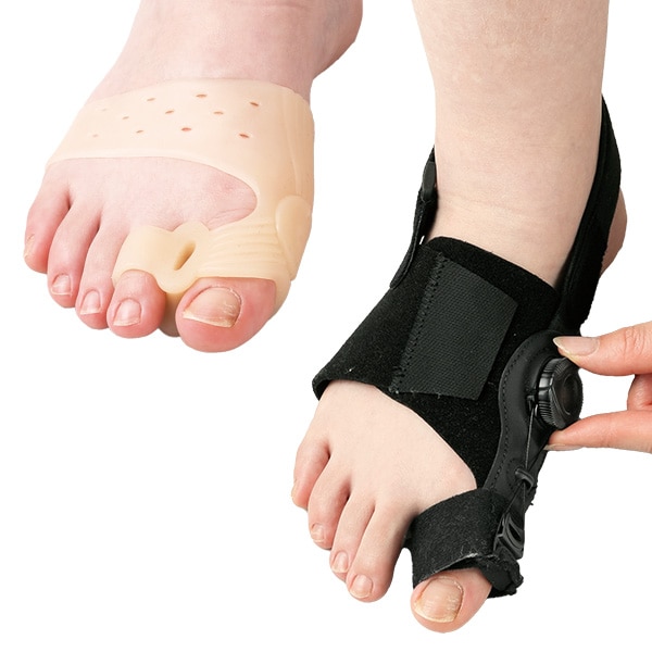 保護用&矯正用。シーンで使い分けて外反母趾をケア! ■保護用1足(左右兼用2枚) クッションで親指をグイッとひっぱって開く! 外出時の保護に。靴も履けて安心。 ・親指を開きやすくする柔らかクッション ・柔らか素材で母趾部分をカバー ・柔らか~く伸びるゲル素材 ・靴をはいても目立たない ・ムレにくい通気孔 ■矯正用1足(左右セット) 変形した親指をワイヤーで広げる! ご自宅で矯正。睡眠時やくつろぎタイムにケア。 ・ダイヤル式のワイヤーで好みの強さに親指を広げて癖付け ◎男女兼用 ◎手洗いOK