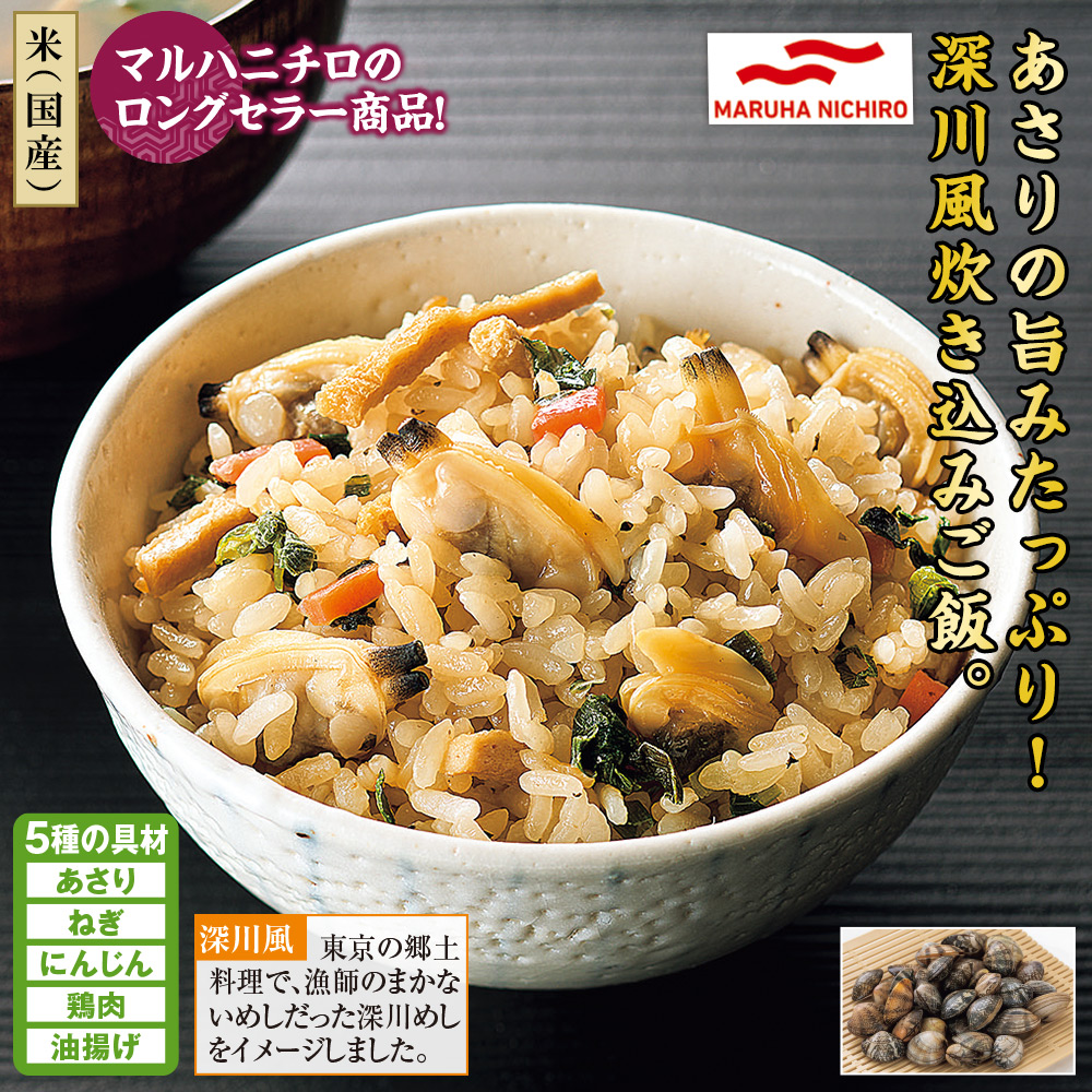 【米(国産)】 マルハニチロのロングセラー商品! こだわりのふっくら粒あさりの旨みと、鰹だしがしみ込んだ簡単調理の炊き込みご飯です。 5種の具材 あさり・ねぎ・にんじん・鶏肉・油揚げ 深川風 東京の郷土料理で、漁師のまかないめしだった深川めしをイメージしました。