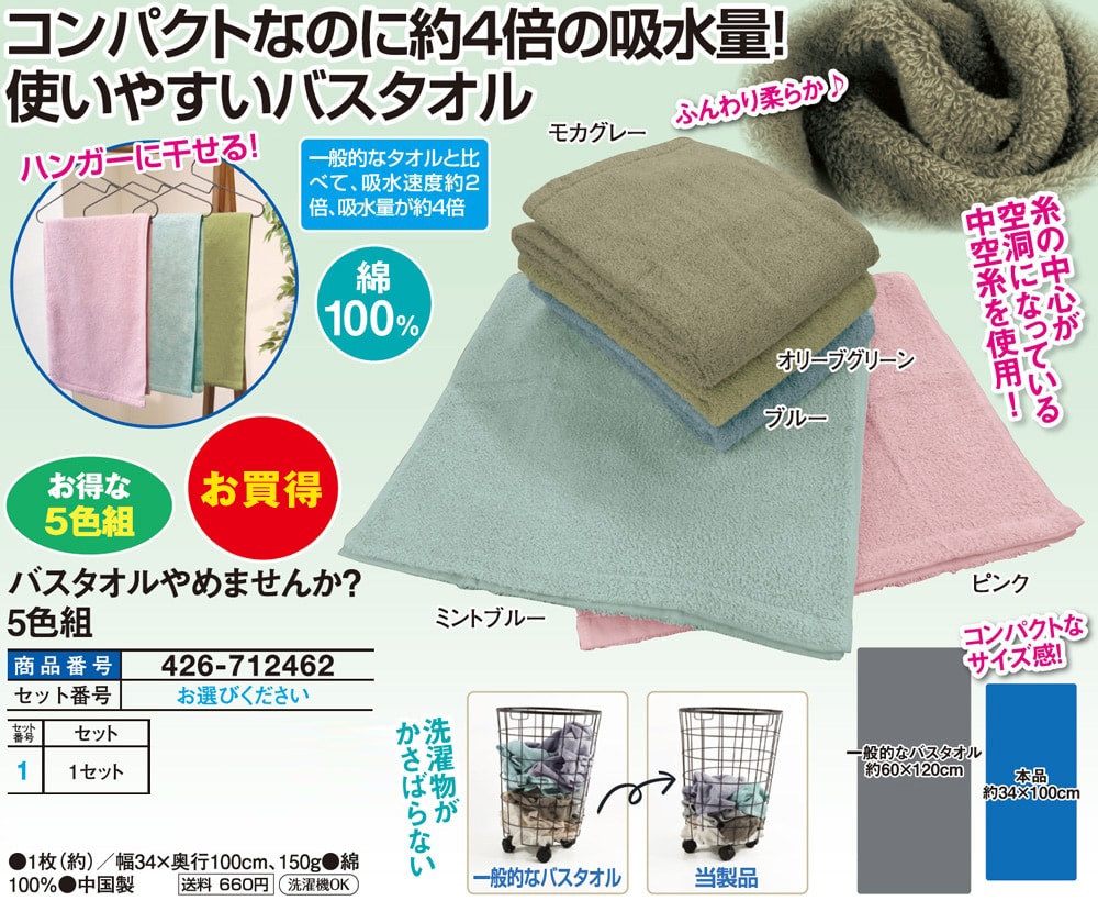一般的なタオルと比べて、吸水速度約2倍、吸水量が約4倍。 糸の中心が空洞になっている中空糸を使用! コンパクトなサイズ感! ハンガーに干せる! ◎お得な5色組 ◎綿100% ◎洗濯物がかさばらない