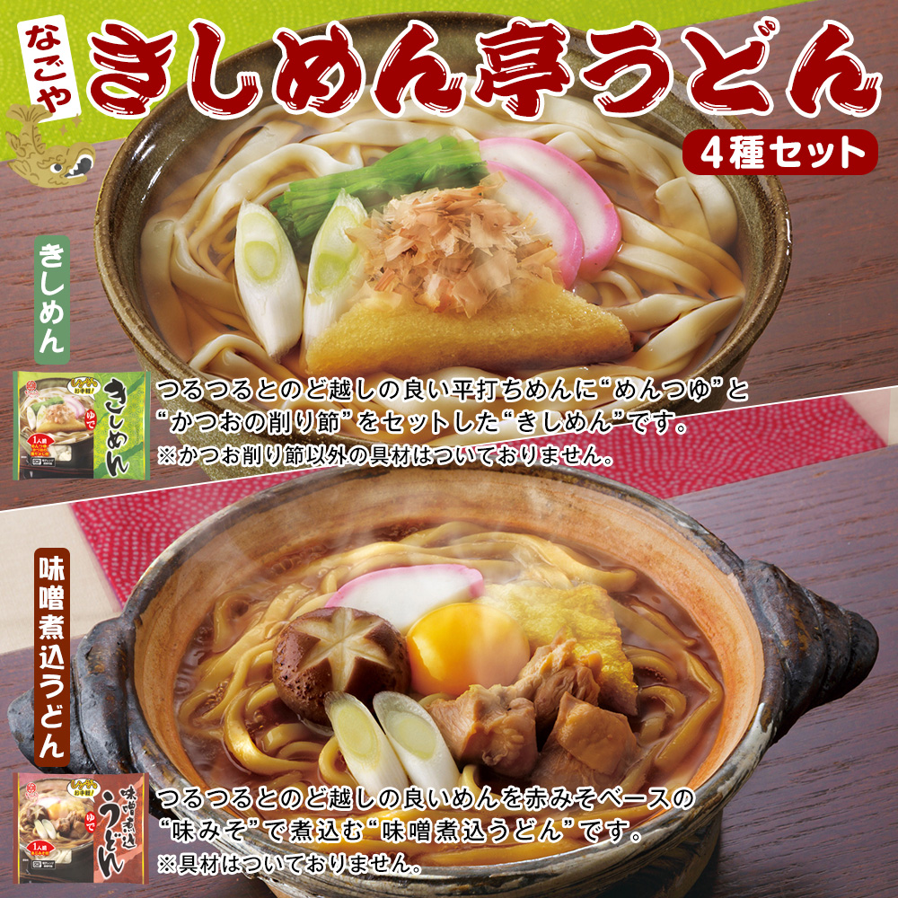きしめんを最初に全国発売した会社としても知られる「なごやきしめん亭」のお手軽4種セットです。 明治10年創業(創業148年) 麺はレンジで温め可能!添付のつゆにお湯を注いで、麺と合わせれば簡単になごやきしめん亭の味をお楽しみ頂けます。 ●きしめん・・・ つるつるとのど越しの良い平打ちめんにめんつゆとかつおの削り節をセットしたきしめんです。 ※かつお削り節以外の具材はついておりません。 ●味噌煮込うどん・・・ つるつるとのど越しの良いめんを赤みそベースの味みそで煮込む味噌煮込うどんです。 ※具材はついておりません。 ●カレーうどん・・・ 和風だしとスパイスのバランスの良い中辛のカレーうどんです。 ※具材はついておりません。 ●あんかけうどん・・・ かつおだしの良く効いたとろみのあるあんと絡めて食べるあんかけうどんです。 ※具材はついておりません。