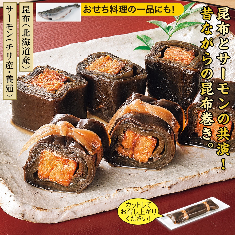【サーモン(チリ産・養殖)】【昆布(北海道産)】 北海道産の昆布を使い1本ずつ丁寧に巻いて、伝統の製法で炊き上げて風味豊かに味付けしました。 おせち料理の一品にも! カットしてお召し上がりください!