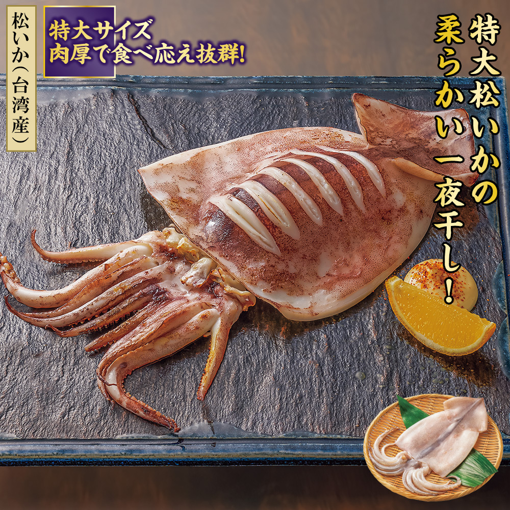 【松いか(台湾産)】 特大サイズ肉厚で食べ応え抜群! 台湾産の特大松いかを独自の製法で一夜干しにしました。 いかの旨みたっぷり。炒めものや天ぷらなどアレンジ自在!