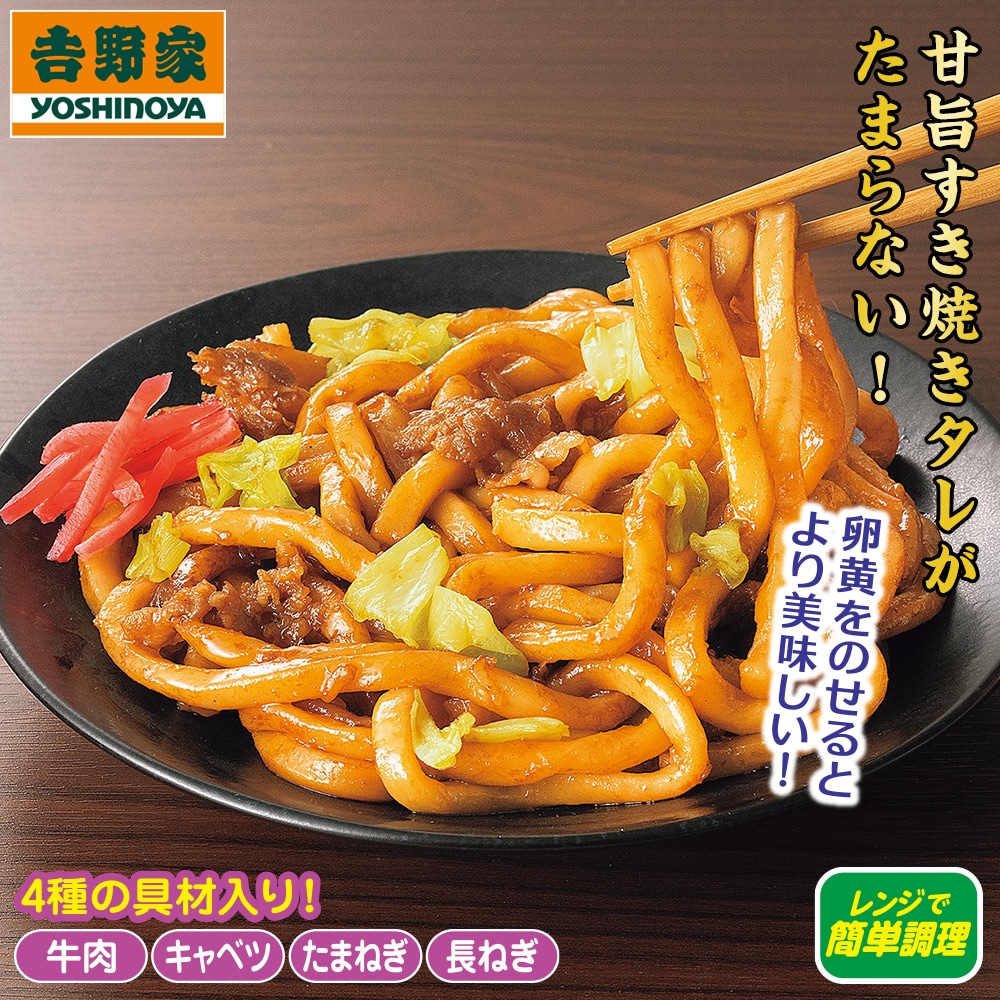 「吉野家監修」の甘旨すき焼きタレを、もちもちの特製うどん麺に絡めて直火で焼き上げました。 卵黄をのせるとより美味しい! 4種の具材入り! ・牛肉・キャベツ・たまねぎ・長ねぎ レンジで簡単調理。