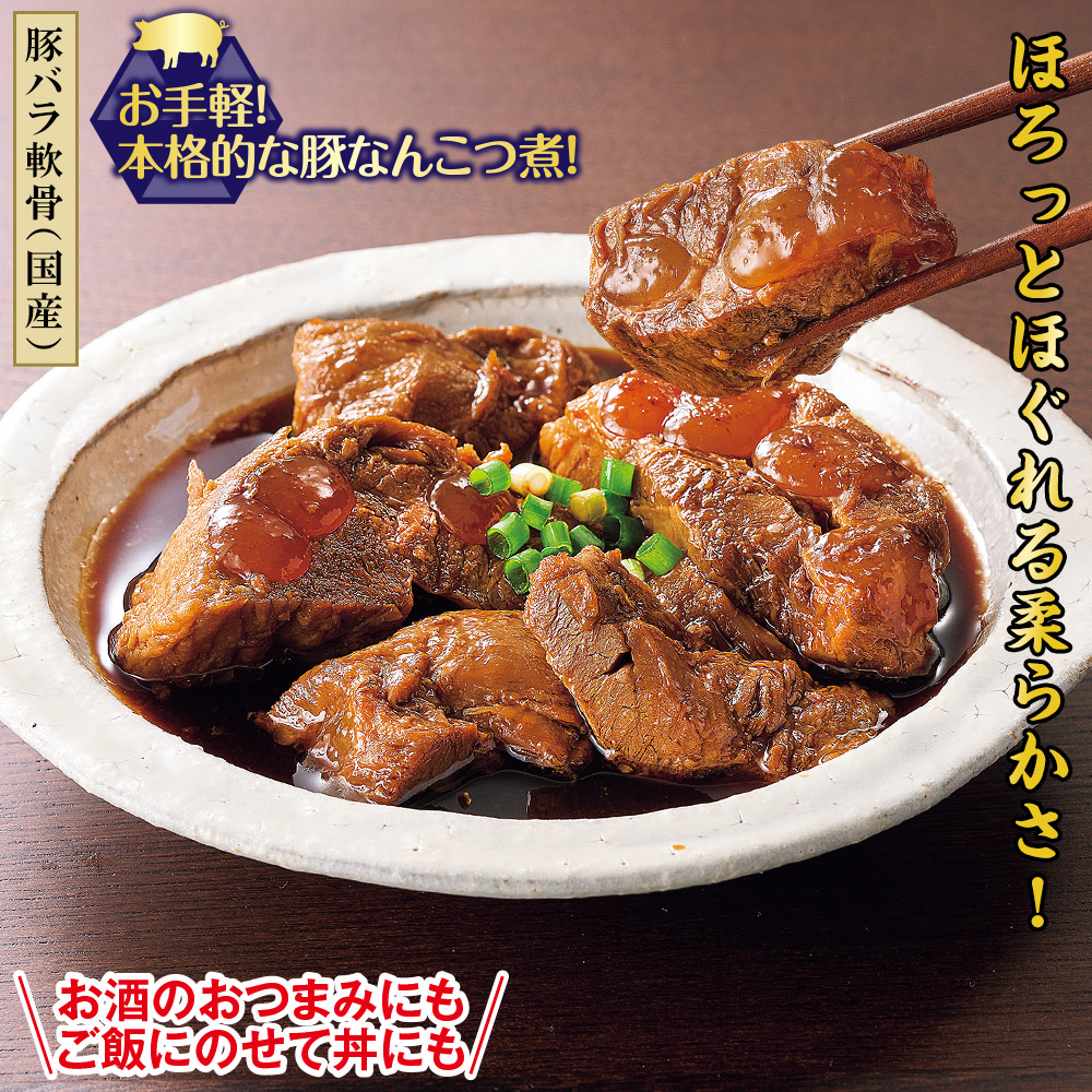 【豚バラ軟骨(国産)】 お手軽!本格的な豚なんこつ煮! 特製醤油だれで、軟骨ごとトロトロになるまでじっくり煮込みました。 本格的な豚バラ軟骨煮です。 お酒のおつまみにも。ご飯にのせて丼にも。