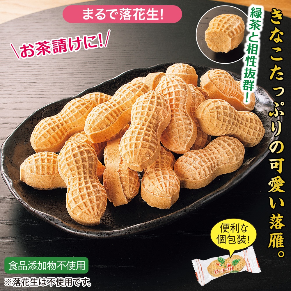 まるで落花生!緑茶と相性抜群!お茶請けに! きな粉を主原料に使った落雁です。 見た目も楽しめる落花生の形に打ち出しました。 食品添加物不使用。 便利な個包装!