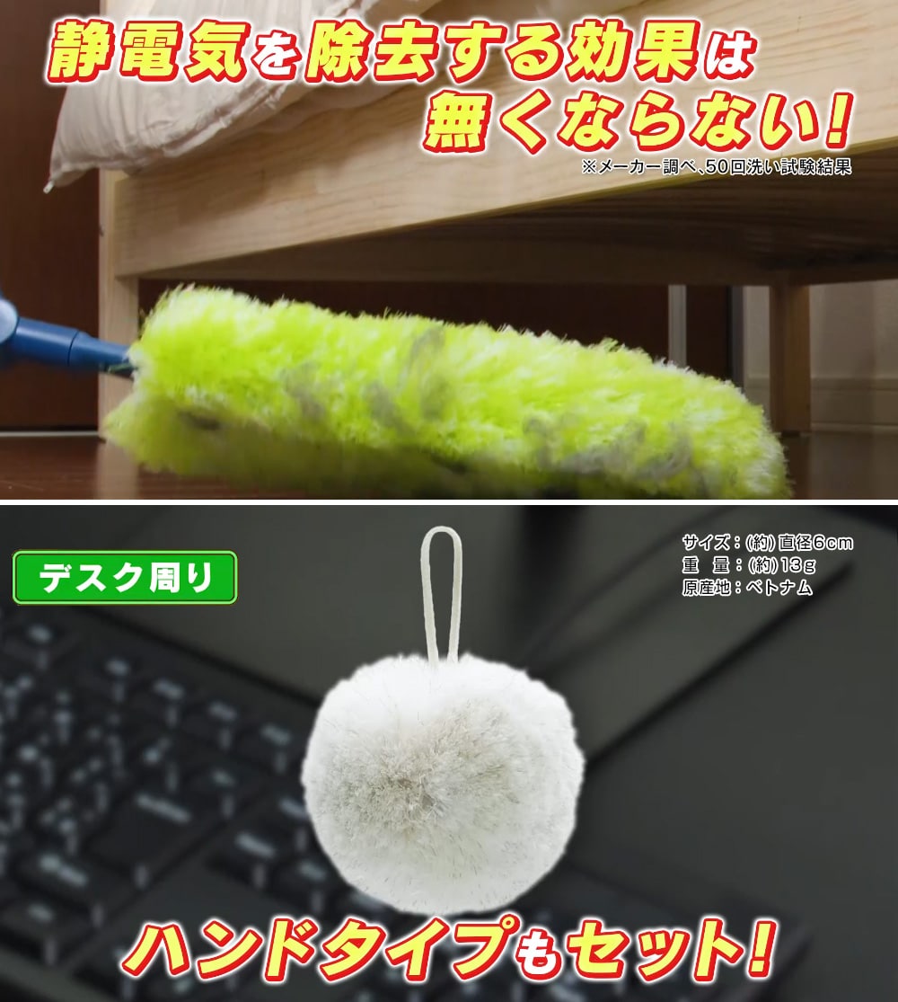 静電気とホコリを同時に除去! ホコリが再付着しにくくなります。 1.6m伸びるロングハンドル付き! エアコンの上・冷蔵庫の上・床やベッドの下・家具の隙間も! お手入れは掃除機で吸うだけ! 水洗いもOK!干して繰り返し使えます! 静電気を除去する効果はなくなりません! (※メーカー調べ、50回洗い試験結果) パソコンやデスク周りのお掃除に便利なハンドタイプ、洗剤いらずの万能マイクロファイバークロス5枚付属!