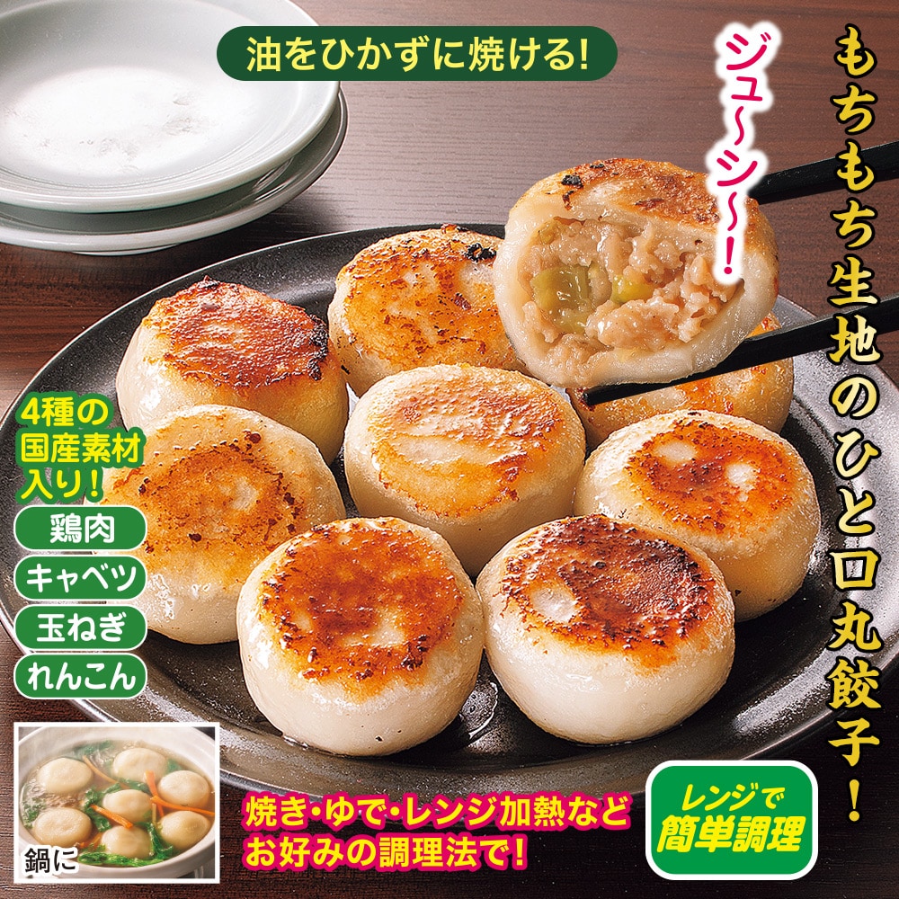 油をひかずに焼ける! 便利なひと口サイズの餃子です。 表面には自家製チキンオイルをかけているので、油不要でそのまま焼けます。 焼き・ゆで・レンジ加熱などお好みの調理法で! 4種の国産素材入り! ・鶏肉・キャベツ・玉ねぎ・れんこん レンジで簡単調理。