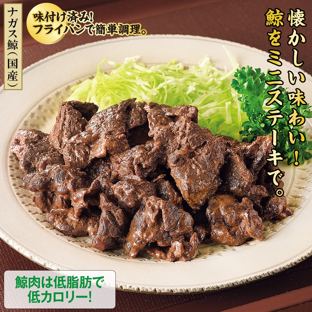 【ナガス鯨(国産)】 味付け済み!フライパンで簡単調理。 鯨肉は低脂肪で低カロリー! 鮮度の良いナガス鯨肉を食べやすいミニステーキにしました。 醤油をベースに生姜風味で仕上げました。