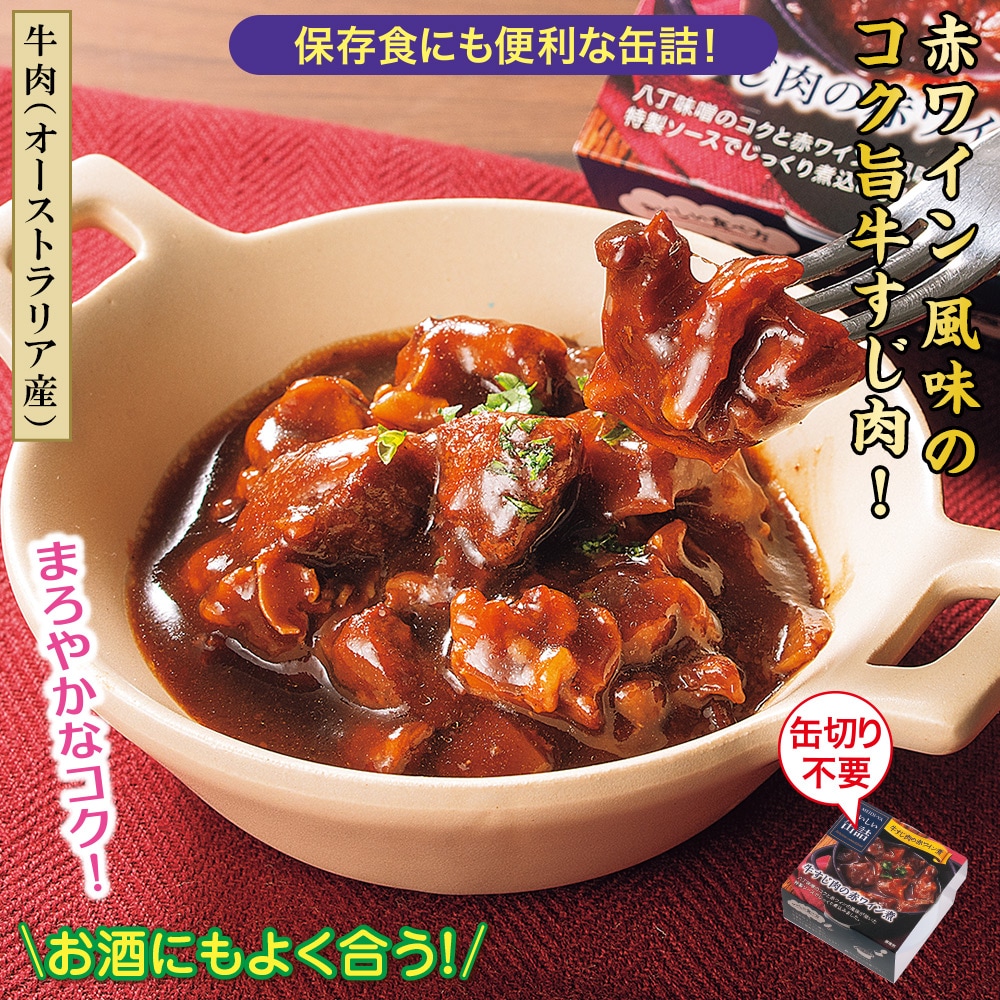 【牛肉(オーストラリア産)】 牛すじ肉と牛すね肉を、八丁味噌のコクと赤ワインの風味がきいた特製ソースでじっくり煮込みました。 保存食にも便利な缶詰! まろやかなコク!お酒にもよく合う! 缶切り不要
