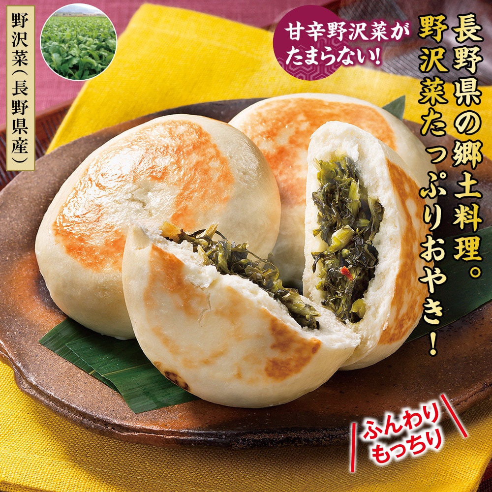 【野沢菜(長野県産)】 甘辛野沢菜がたまらない! 国産の小麦粉と豆乳で作った生地に、甘辛く炊いた野沢菜などをたっぷり入れて包み焼き上げました。 懐かしい味わいの長野県に伝わる郷土料理です。 ふんわりもっちり。