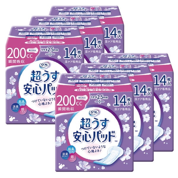 “超うす”なのに安心の吸水力! 吸水パッド。 吸水後の逆戻りが少なく、さらっとしたつけ心地。 吸水量120cc/200cc。 尿もれ対策。 \超うす!/ 薄さ約2mm ※120ccタイプ 【脱臭シート】臭いを吸収し閉じ込める 【消臭ポリマー】アンモニアの臭いを軽減 【銀イオン】臭いのもととなる菌の増殖を抑制 薄いから目立ちにくく快適! 肌に接する面は素肌と同じ弱酸性シート。 立体ギャザーで横モレ防止。 ●120cc:1パック20枚入り。 ●200cc:薄さ約2.5mm。うしろ広めデザイン。長時間のお出かけにも安心。1パック14枚入り。 ●女性用