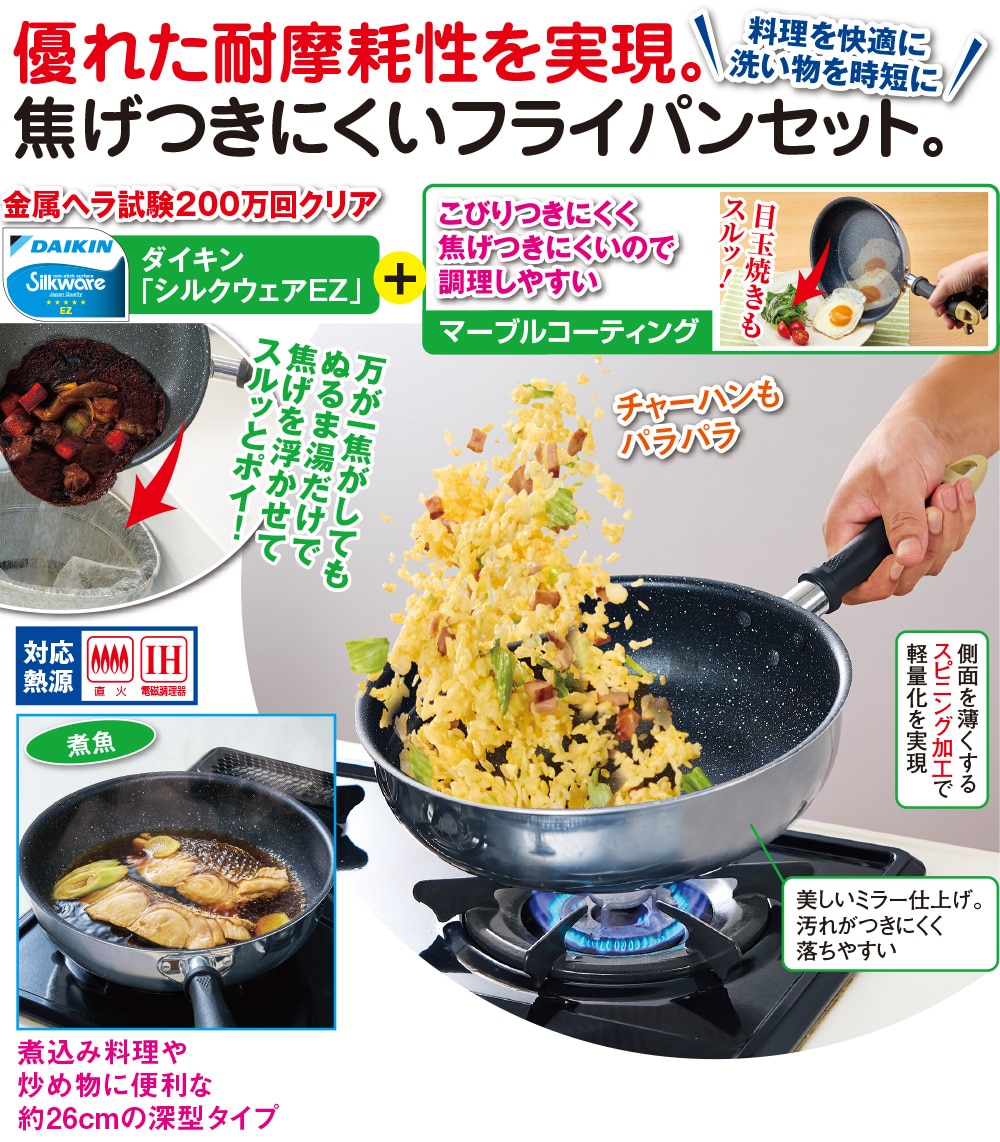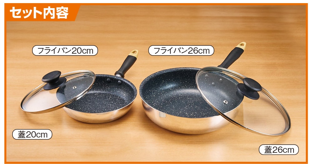 ●(約)/<フライパン20cm>径21.5×高さ5(深さ4.5)cm、410g、<フライパン26cm>径27.5×高さ7.5(深さ7)cm、700g、<蓋20cm>径21.5×高さ6cm、<蓋26cm>径27×高さ7cm ●<フライパン>本体:アルミニウム合金(内面:フッ素樹脂塗膜加工、外面:ミラー仕上げ)、はり底:ステンレス鋼(クロム18%)、取っ手:フェノール樹脂、<蓋>アルミニウム合金(焼付塗装)・強化ガラス ●取扱説明書付 ●中国製 <三徳包丁> ●(約)/全長230mm(刃渡り125mm) ●(刃)ステンレス鋼、両刃付け(ハンドル)ポリプロピレン <キッチンはさみ> ●(約)/全長215mm(刃渡り75mm) ●(金属部)ステンレス鋼(ハンドル)ポリプロピレン