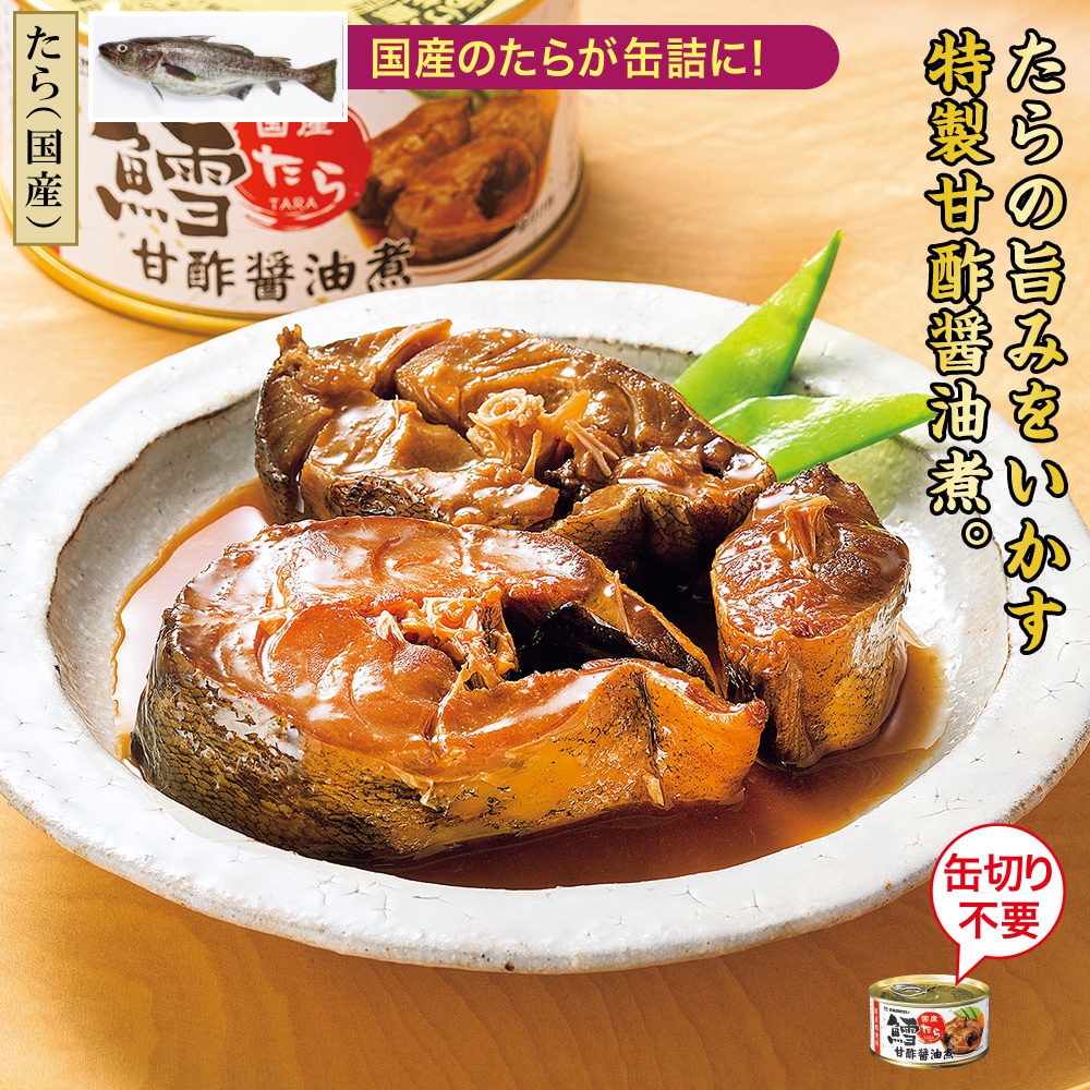 【たら(国産)】 国産のたらが缶詰に! 鮮度のよい国産のたらを、コクのある甘さに酸味がきいた特製甘酢醤油ダレで上品な味わいに仕上げました。 缶切り不要