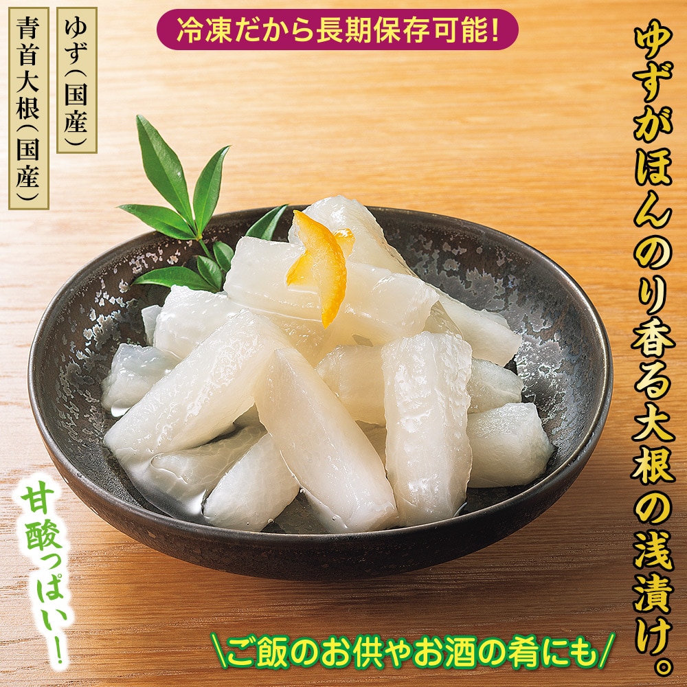 【ゆず(国産)】【青首大根(国産)】 冷凍だから長期保存可能! 新鮮な青首大根の皮を剥いて、食べやすい大きさの拍子切り、香り高い国産のゆずとともに漬け込みました。 ご飯のお供やお酒の肴にも! 甘酸っぱい!