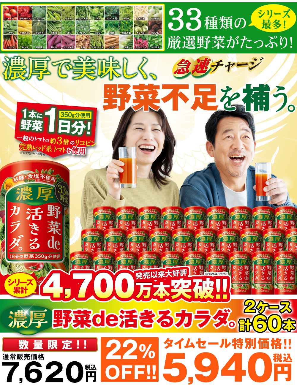 濃厚野菜de活きるカラダ。のこだわりポイント 【濃い!】 1本125gに約3倍の野菜350g分をギュッと凝縮 トロっと濃厚で、まるで果物ジュースのような味わい。 【33種類の野菜を使用】 栄養のバランスを考えて、果菜、葉菜、根菜をバランスよく厳選。 【ゴミ出し簡単、環境に優しいエコ容器を採用】 軽くて簡単に潰せるエコ容器(カート缶)を採用。 普段の食生活の栄養の偏りが気になる方に、1本プラスするだけで栄養バランスがぐっと整います! ★こんなときにおすすめ ・外食、コンビニ弁当を利用する機会の多い方 ・野菜を普段あまり食べない方、野菜が苦手な方 ・ダイエット中の方 ・生野菜の高騰時の代替品として