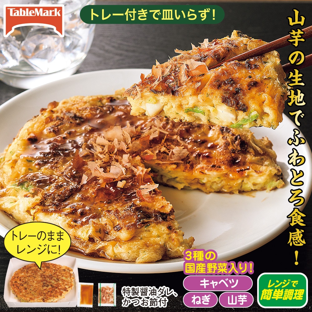 トレー付きで皿いらず! 小麦粉の代わりに国産米粉を使用し、国産山芋を練りこんだ生地でふわとろ食感に仕上げました。 3種の国産野菜入り! ・キャベツ・ねぎ・山芋 特製醤油ダレ、かつお節付。 レンジで簡単調理。