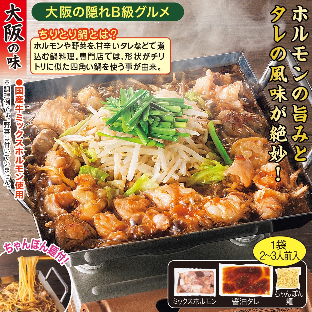 大阪の隠れB級グルメ 国産牛のミックスホルモンと、コクのある醤油タレがセットになった本格鍋セットです。 ちゃんぽん麺付! ちりとり鍋とは? ホルモンや野菜を、甘辛いタレなどで煮込む鍋料理。専門店では、形状がチリトリに似た四角い鍋を使う事が由来。
