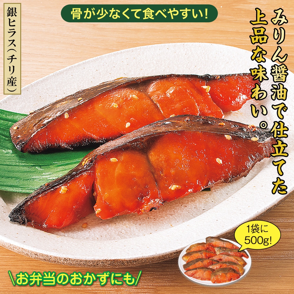 【銀ヒラス(チリ産)】 骨が少なくて食べやすい! 脂がのった白身魚である銀ヒラスを、みりんベースの甘辛いタレにじっくりと漬け込みました。 お弁当のおかずにも。