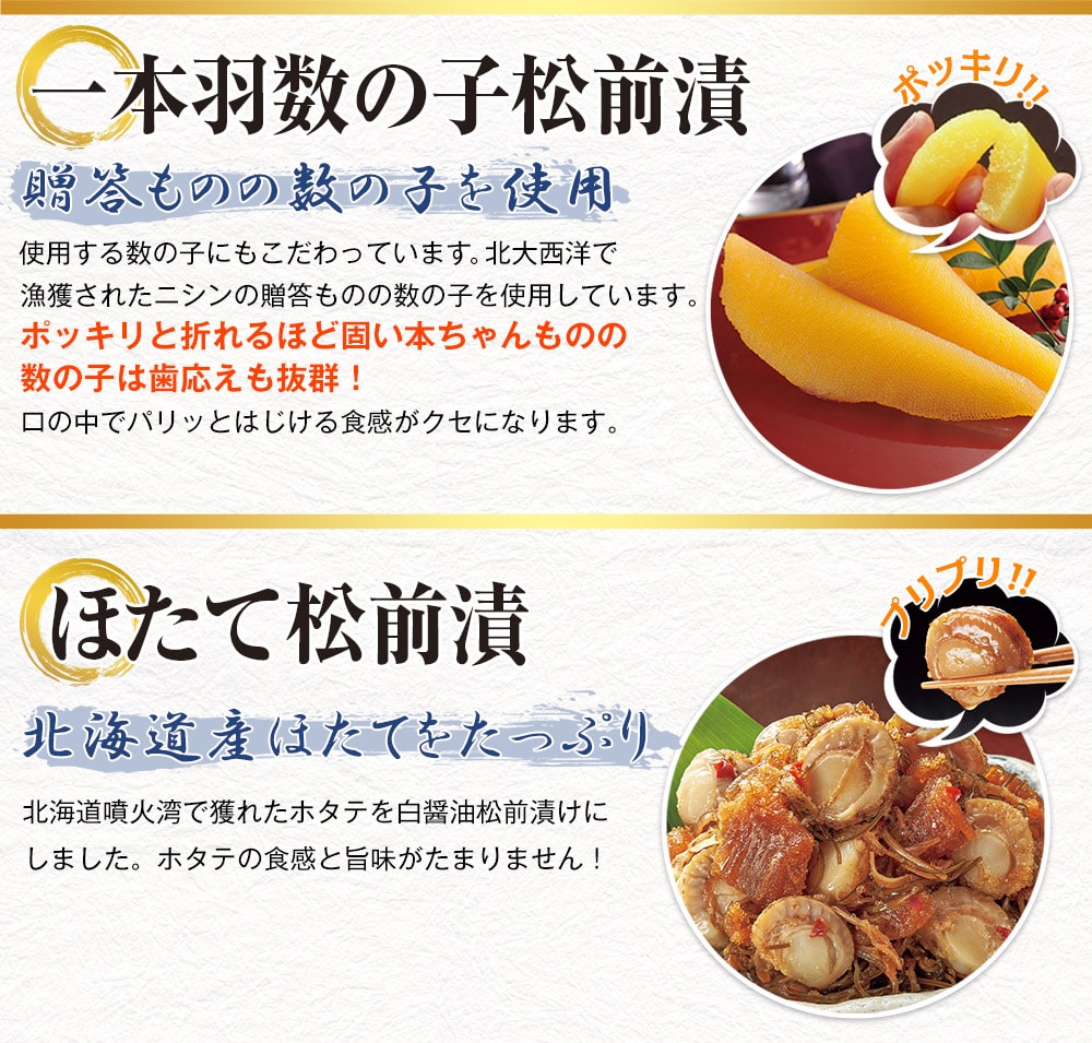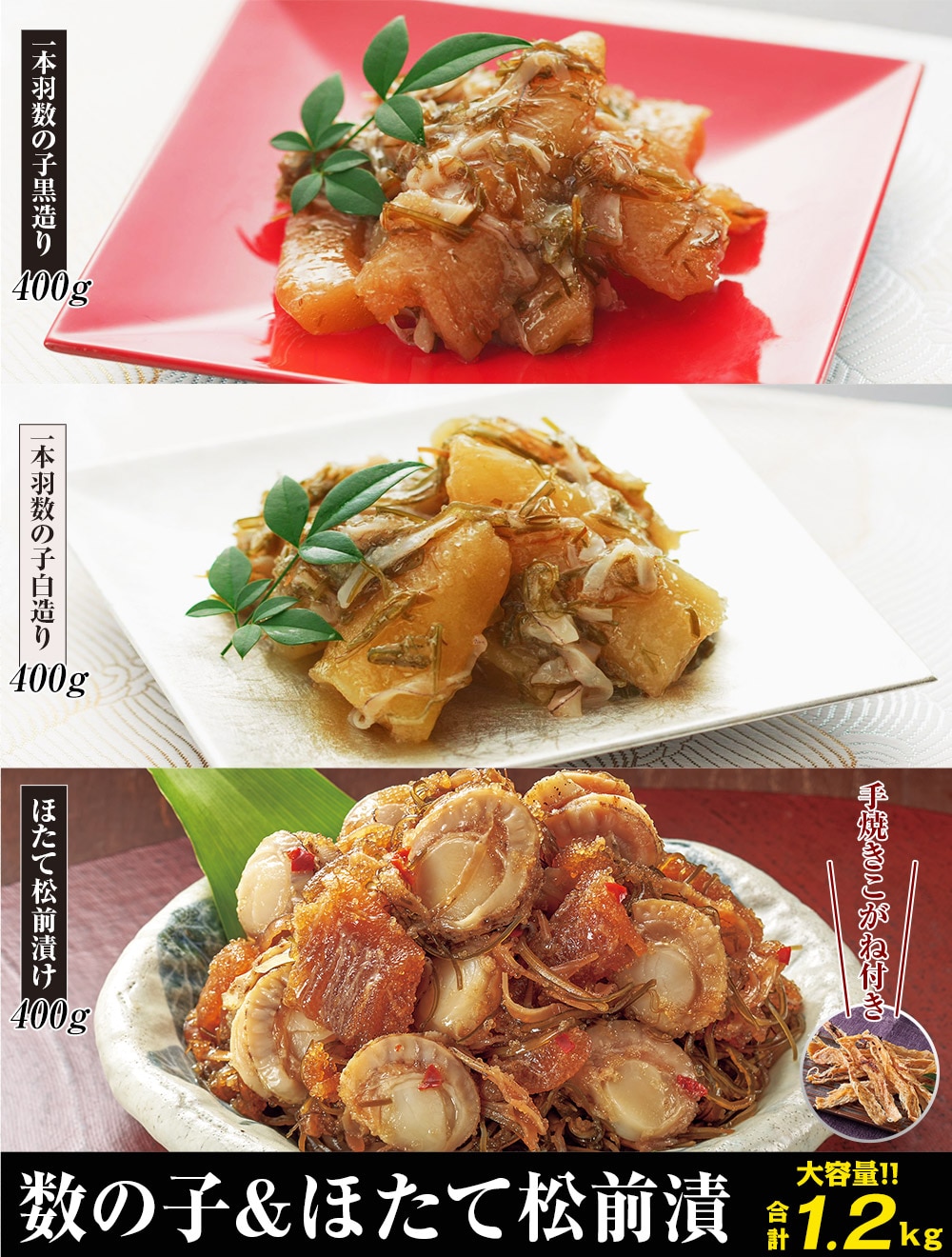 ●セット内容/黒醤油400g×1袋、白醤油400g×1袋、ホタテ松前漬400g×1袋、手焼きこがね23g×1袋 ●賞味期限/製造日から冷凍1年 ●加工地/日本 ●原材料/【黒醤油】数の子(ロシア産、アメリカ産、ドイツ産)、醤油、米発酵調味料、砂糖、かつお節エキス、いか(国産)、昆布(北海道産)、がごめ昆布(北海道産)、赤唐辛子/甘味料(ソルビトール)、酒精、調味料(アミノ酸等)、増粘多糖類【白醤油】数の子(ロシア産、アメリカ産、ドイツ産)、蛋白加水分解物、酵素糖化水飴、米発酵調味料、いか(国産)、砂糖、昆布(北海道産)、がごめ昆布(北海道)、醤油、かつお節エキス、赤唐辛子/甘味料(ソルビトール)、酒精、調味料(アミノ酸等)【ホタテ】ほたて(北海道産)、数の子(ロシア産、ドイツ産)、するめ(国産)、真昆布(北海道産)、醤油、がごめ昆布(北海道産)、米発酵調味料、砂糖、かつお節エキス、赤唐辛子、蛋白加水分解物/ソルビトール、調味料(アミノ酸等)、増粘多糖類【手焼きこがね】いか(国産、ロシア産)、砂糖、食塩/ソルビトール、調味料(アミノ酸等) ●特定原材料等 /小麦・いか・大豆