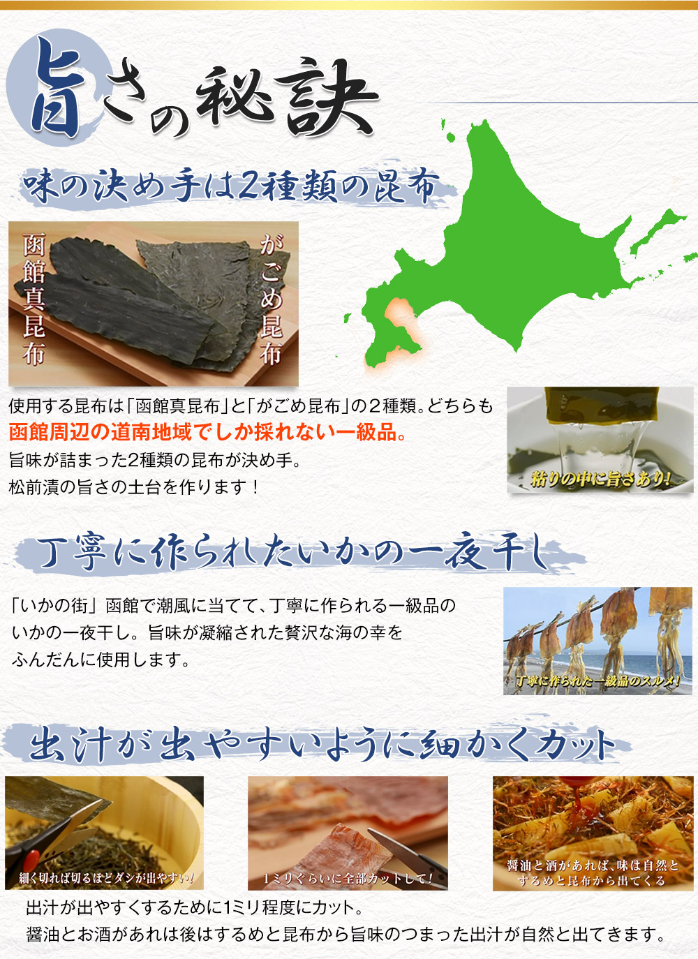 ■黒造り松前漬け 黒醤油ベースの味付けでいか、昆布等をじっくりと漬け込んでいますので、お酒のおつまみやご飯のおかずに最適です。 ■白造り松前漬け 白醤油ベースの味付けでいか、昆布等をじっくりと漬け込んでいますので、お酒のおつまみやご飯のおかずに最適です。 ■ほたて松前漬け 北海道噴火湾で獲れたホタテを白醤油松前漬けにしました。 <プレゼント>手焼きこがね するめいかを鮮度の良いうちに処理し、特製調味で味付けし乾燥させ、1枚1枚丁寧の芳ばしく焼きあげ太く裂きました。 ソフト仕上げで老若男女問わず美味しく頂けます。