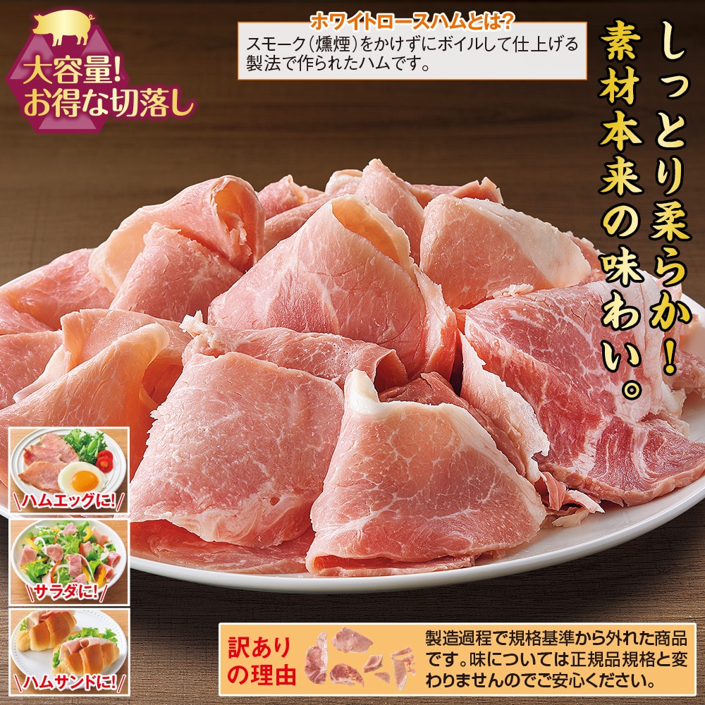 一般的なロースハムと異なりスモーク(燻製)していないタイプです。 しっとり柔らかな食感が特徴です。 ホワイトロースハムとは? スモーク(燻煙)をかけずにボイルして仕上げる製法で作られたハムです。 ・ハムエッグに・サラダに・ハムサンドに 訳ありの理由 製造過程で規格基準から外れた商品です。 味については正規品規格と変わりませんのでご安心ください。