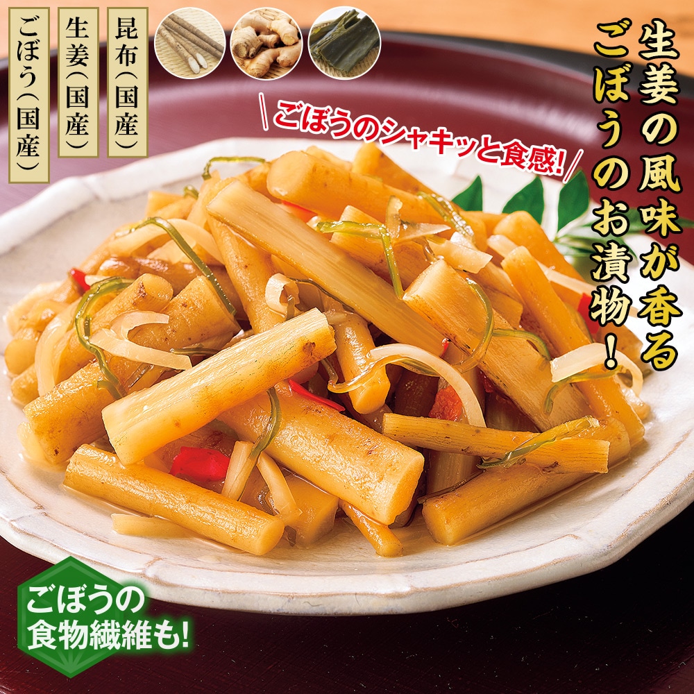 【ごぼう(国産)】【生姜(国産)】【昆布(国産)】 ごぼうの食物繊維も! ごぼうのシャキッと食感! 歯ごたえの良いごぼうを、生姜の爽やかでさっぱりとした風味と、昆布の豊かな味わいで仕上げました。