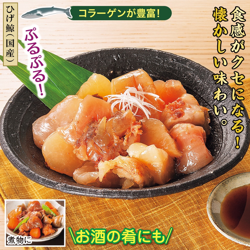 【ひげ鯨(国産)】 コラーゲンが豊富! 希少なひげ鯨のすじ肉です。 加熱すると柔らかくなり、おでんやカレーなどの多様な料理でもいただけます。 お酒の肴にも。煮物にも。