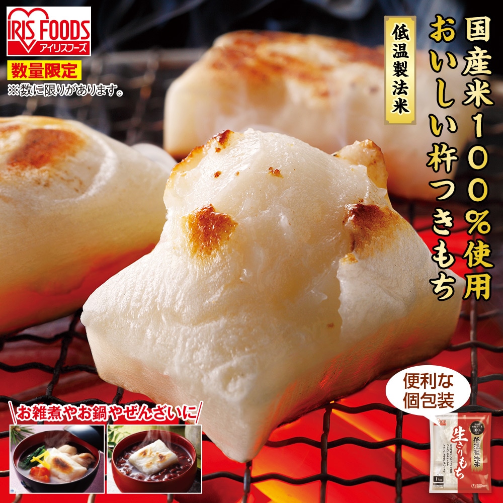 低温製法米 低温で精米したもち米を使用。 つきたてのおいしさと、なめらかな食感が味わえます。 お雑煮やお鍋やぜんざいに。 数量限定 ※数に限りがあります。 便利な個包装。