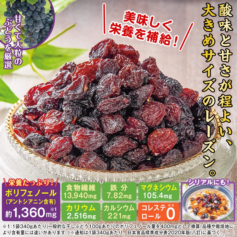 ※1:1袋340gあたり(一般的な干しぶどう100gあたりのポリフェノール量を400mgとして換算。品種や栽培地により含有量には違いがあります。)