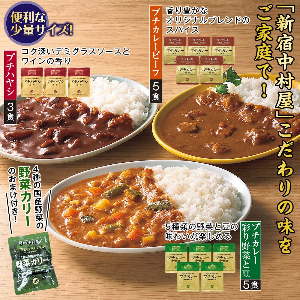 ●セット内容/プチカレービーフ(120g)×5食、プチカレー彩り野菜と豆(120g)×5食、プチハヤシ(120g)×3食、野菜カリー(170g)×1食 ●賞味期限/製造日から常温1年6ヵ月 ●加工地/日本 ●原材料/<ビーフカレー>野菜(玉ねぎ(国産)、にんにく)、牛肉、りんごピューレ、野菜ソテーペースト(玉ねぎ、キャベツ、にんじん、白菜、大豆もやし、アスパラガス、ブロッコリー、大豆油、セロリ)、食用油脂(なたね油、ラード、大豆油)、小麦粉、ソテーキャロット、カレー粉、チャツネ、ビーフエキス、ポークブイヨン、食塩、りんご酢、砂糖、たん白加水分解物、バターオイル/着色料(カラメル)、増粘剤(加工でん粉、キサンタン)、調味料(アミノ酸等)、加工でん粉、pH調整剤、酸味料、香辛料抽出物<野菜カレー>野菜(じゃがいも、カボチャ、にんじん、いんげん、しょうが、にんにく)、ソテーオニノン(国内製造)、トマト・ジュースづけ、ひよこ豆、トマトピューレ、野菜ソテーペースト(玉ねぎ、キャベツ、にんじん、白菜、大豆もやし、アスパラガス、ブロッコリー、大豆油、セロリ)、食用油脂(なたね油、大豆油、ラード)、ココナッツミルク、砂糖、カレー粉、香辛料、カシューナッツパウダー、チキンエキス、チキンブイヨン、トマトペースト、食塩、小麦粉、ビーフブイヨン、バターオイル/調味料(アミノ酸等)、パプリカ色素<ハヤシ>野菜(玉ねぎ(国産)、にんにく)、牛肉、デミグラスソース、炒め野菜(玉ねぎ、にんじん、セロリ、大豆油)、トマトケチャップ、発酵調味料、小麦粉、砂糖、ビーフエキス、食用油脂(牛脂、大豆油、ラード)、ブイヨン、ウスターソース、食塩、赤ワイン、バターオイル、香辛料/増粘剤(加工でん粉)、着色料(カラメル)、調味料(アミノ酸等)<野菜カリー>ソテーオニオン(国内製造)、野菜(じゃがいも、にんじん、しょうが、にんにく)、クラッシュトマト、揚げカボチャ、金時豆、なたね油、ココナッツミルク、トマトペースト、砂糖、カレー粉、カシューナッツパウダー、香辛料、こんぶエキス、食塩、白菜エキスパウダー、チキンエキス、酵母エキス、(一部にカシューナッツ・鶏肉を含む) ●特定原材料等 /小麦・乳成分・カシューナッツ・牛肉・大豆・鶏肉・豚肉・りんご・ゼラチン