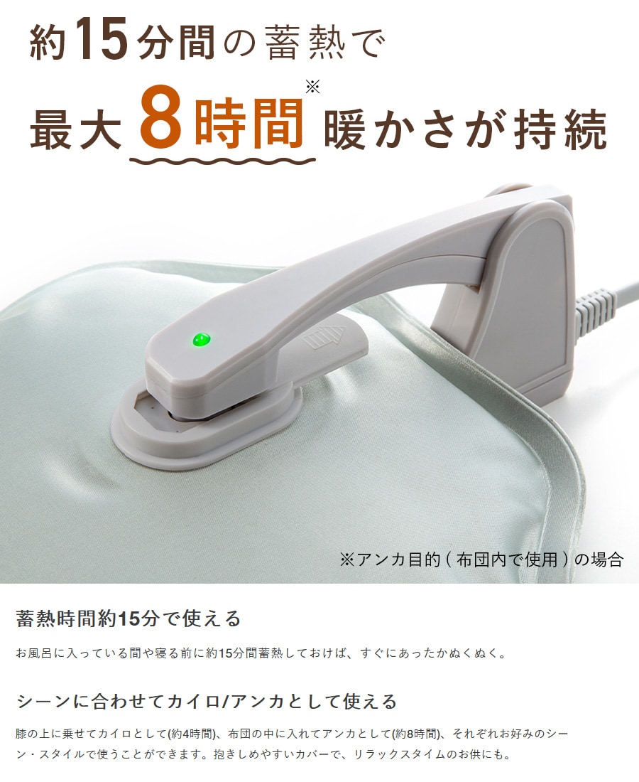 お湯の入れ替えは不要!15分間蓄熱するだけで最長8時間も暖かさが持続。