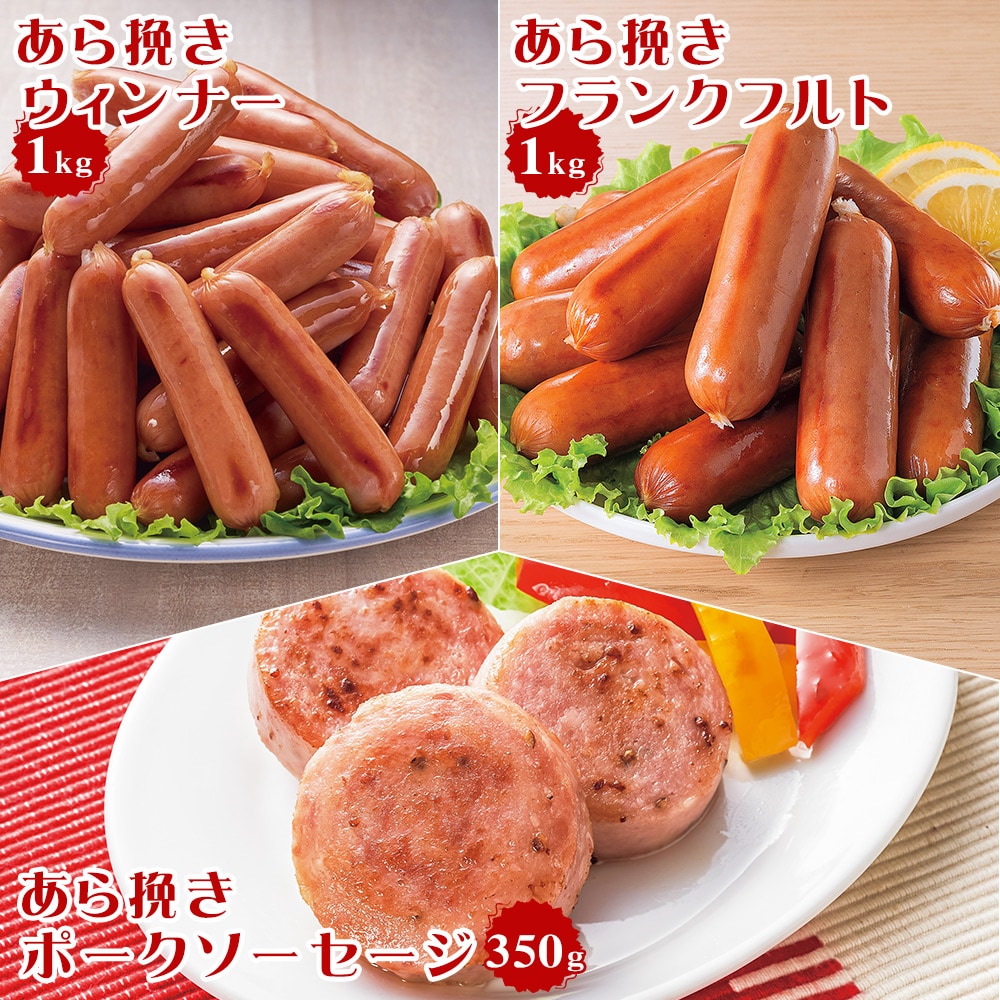●セット内容/<あら挽きウインナー>1kg×1袋<あら挽きフランクフルト>1kg×1袋<あら挽きポークソーセージ>350g×1本 ●原材料/<あら挽きウインナー>豚肉、豚脂肪、結着材料(でん粉、粉末状大豆たん白)、糖類(砂糖、水飴、ぶどう糖)、食塩、香辛料/調味料(アミノ酸等)、リン酸塩(Na)、pH調整剤、保存料(ソルビン酸K)、酸化防止剤(V.C)、発色剤(硝酸K、亜硝酸Na)、香辛料抽出物<あら挽きフランクフルト>豚肉、豚脂肪、結着材料(でん粉、粉末状大豆たん白)、糖類(砂糖、水飴、ぶどう糖)、食塩、香辛料/調味料(アミノ酸等)、リン酸塩(Na)、pH調整剤、保存料(ソルビン酸K)、酸化防止剤(V.C)、発色剤(硝酸K、亜硝酸Na)、香辛料抽出物<あら挽きポークソーセージ>豚肉、豚脂肪、結着材料(でん粉、粉末状大豆たん白)、糖類(砂糖、水飴、ぶどう糖)、食塩、香辛料/調味料(アミノ酸等)、リン酸塩(Na)、pH調整剤、保存料(ソルビン酸K)、発色剤(硝酸K、亜硝酸Na)、酸化防止剤(ビタミンC) ●賞味期限/<あら挽きウインナー>製造日から冷凍1年<あら挽きフランクフルト>製造日から冷凍1年<あら挽きポークソーセージ>製造日から冷凍1年 ●加工地/<あら挽きウインナー>日本<あら挽きフランクフルト>日本<あら挽きポークソーセージ>日本 ●特定原材料/<あら挽きウインナー>牛肉・大豆・豚肉<あら挽きフランクフルト>牛肉・大豆・豚肉<あら挽きポークソーセージ>大豆・豚肉